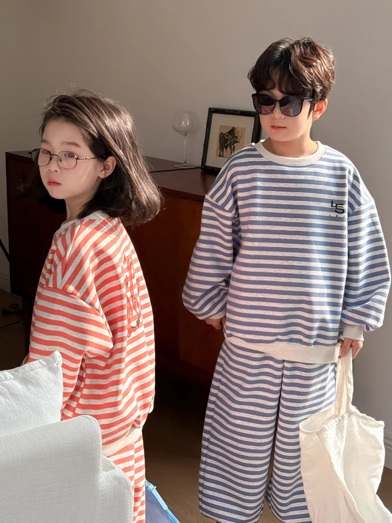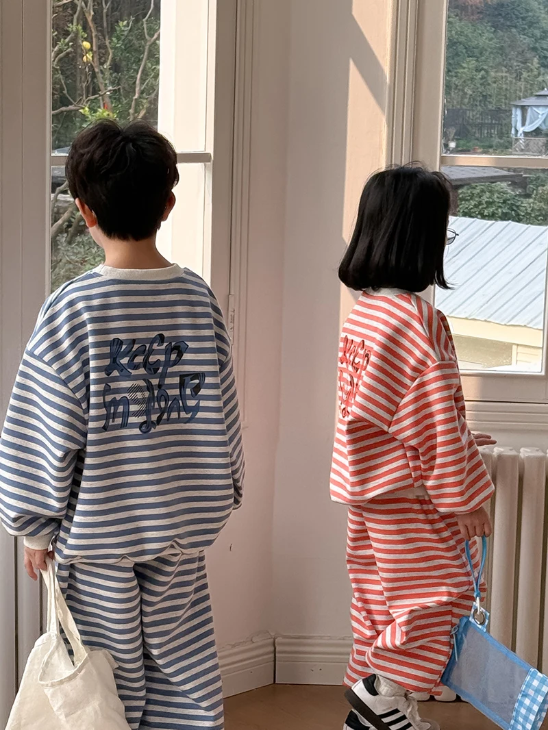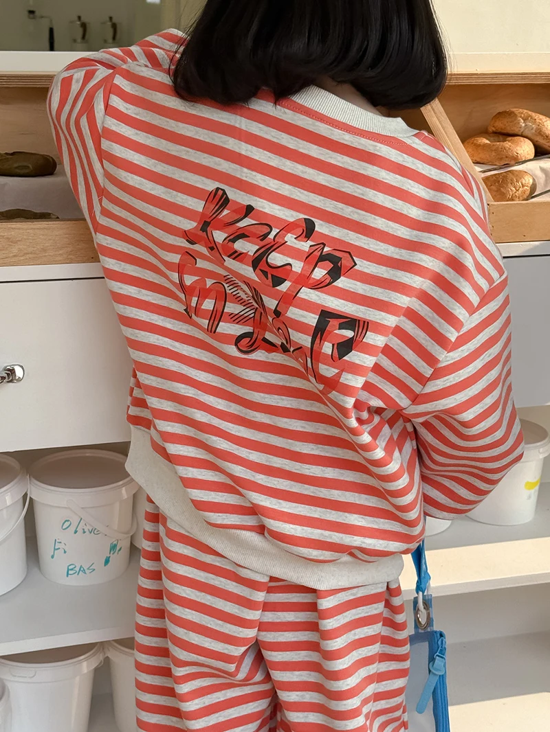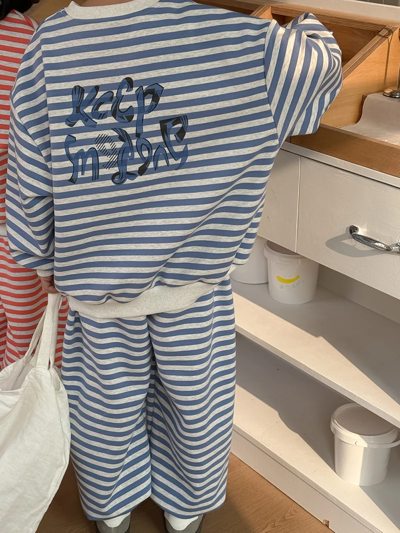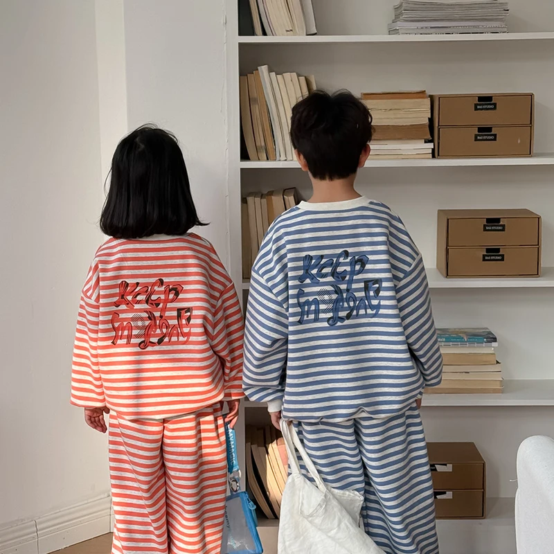 This children's set features a trendy Korean style, making your little one stand out with its unique striped letter printed sweatshirt.