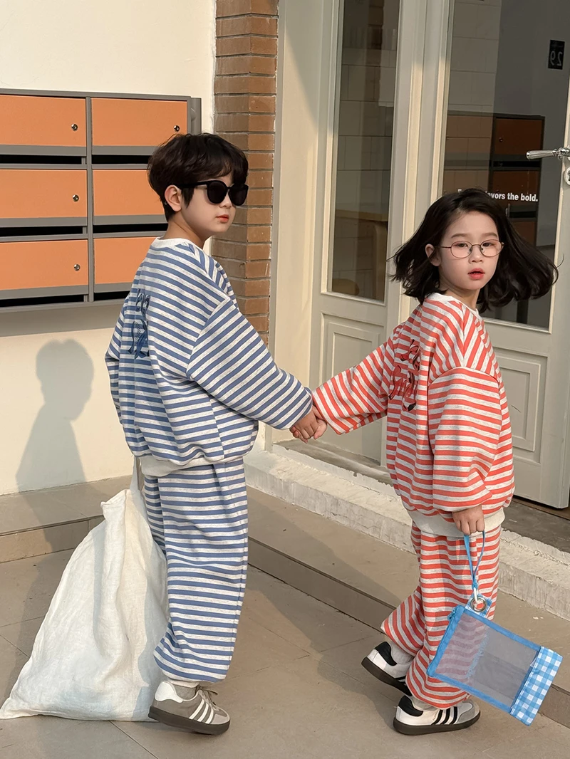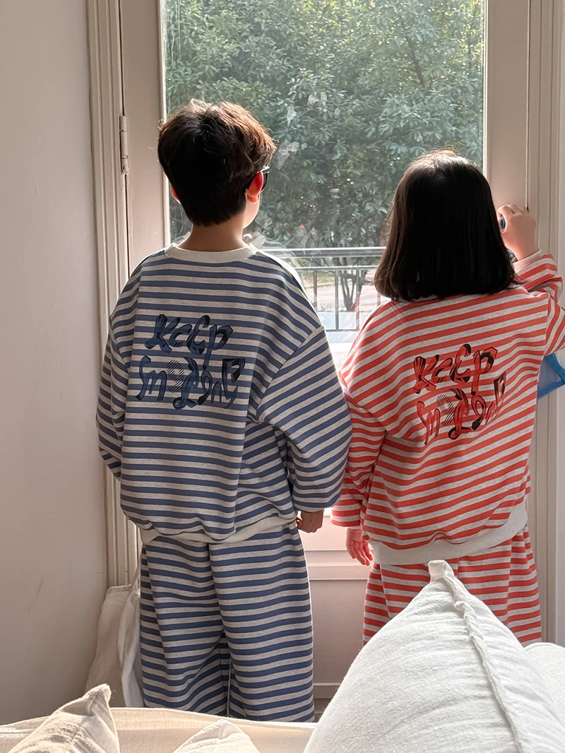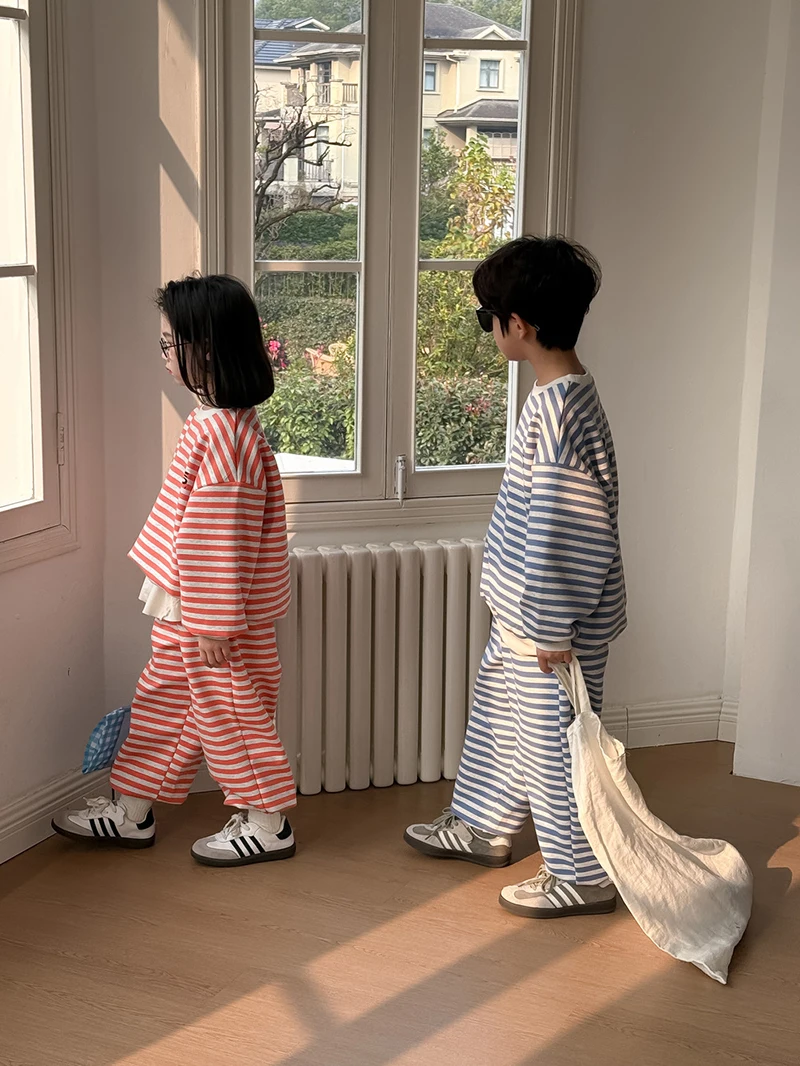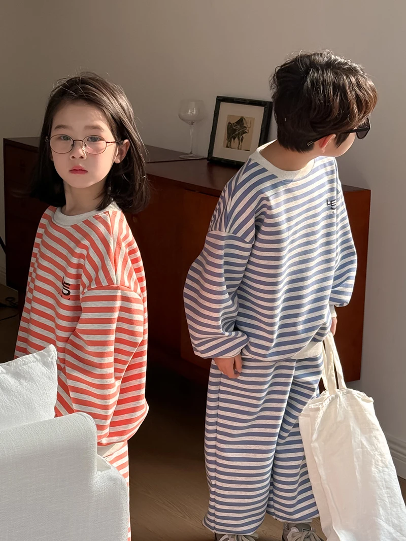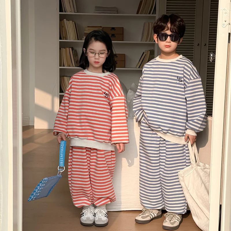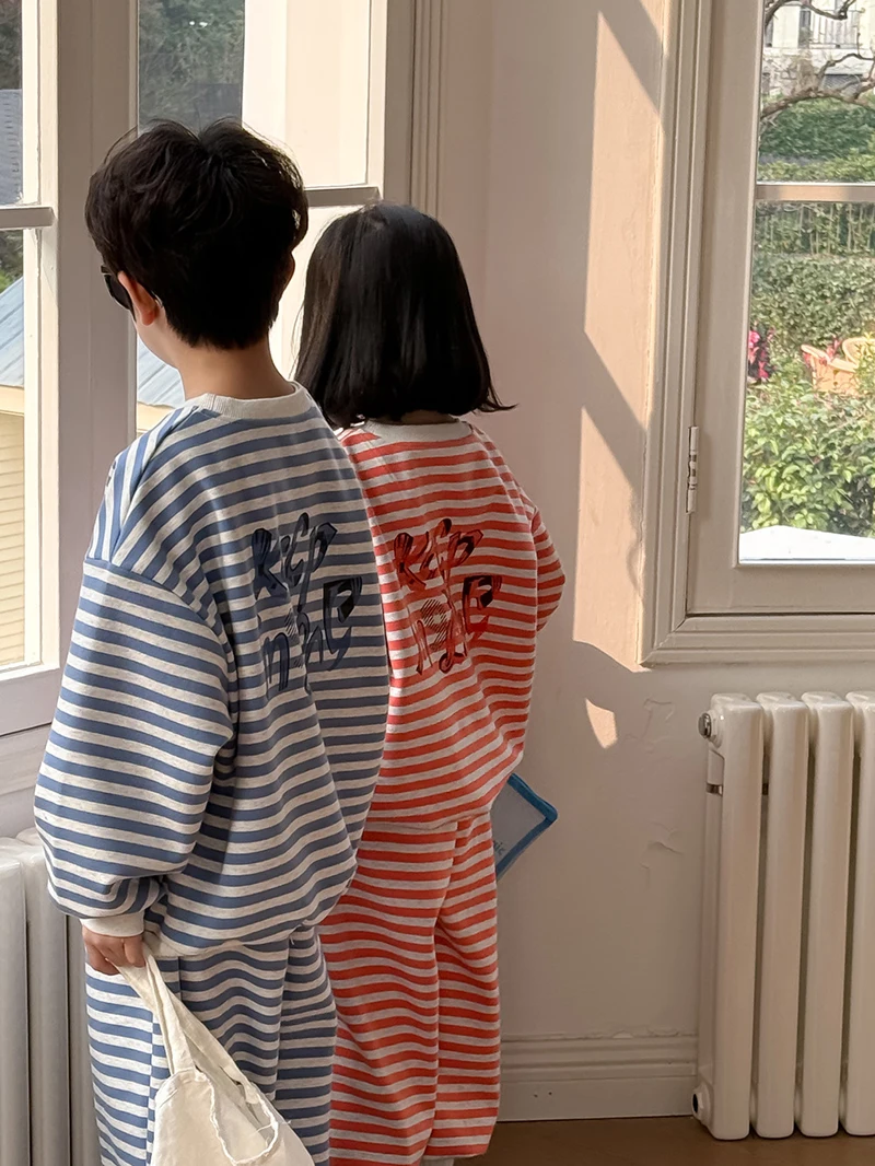 This children's set features a trendy Korean style, making your little one stand out with its unique striped letter printed sweatshirt.
