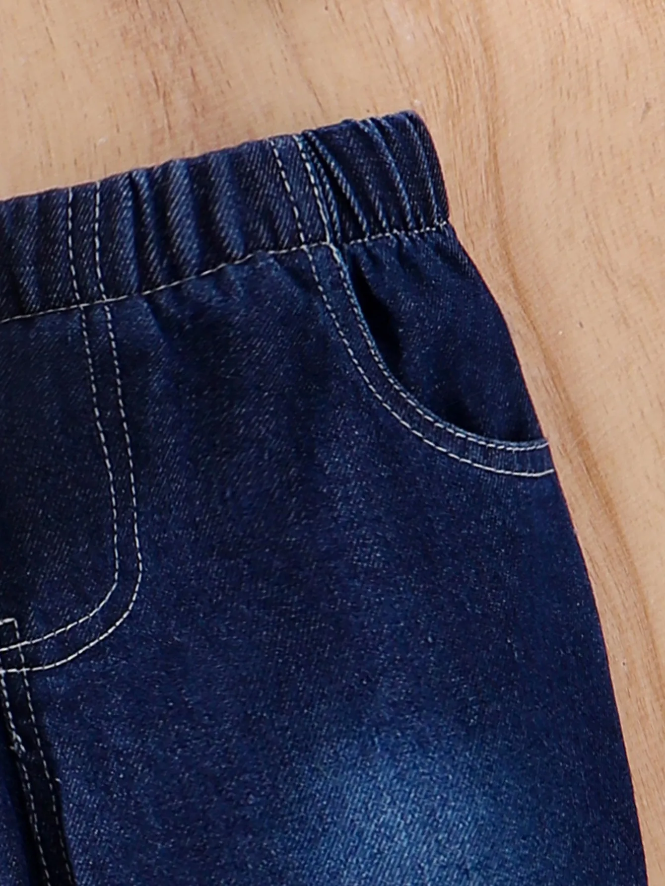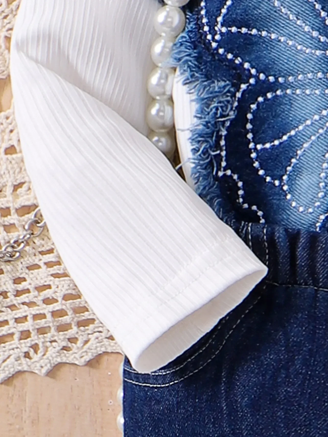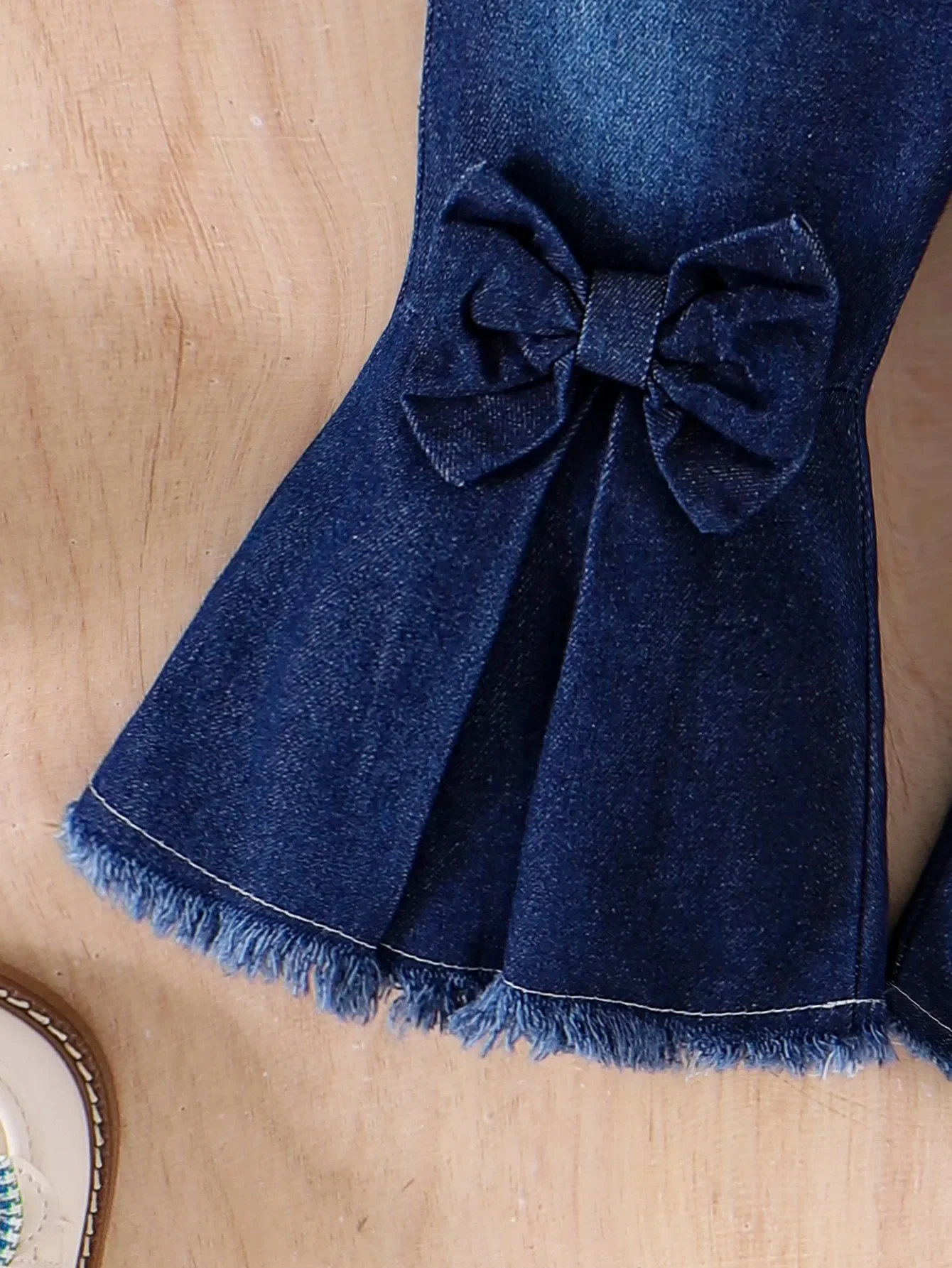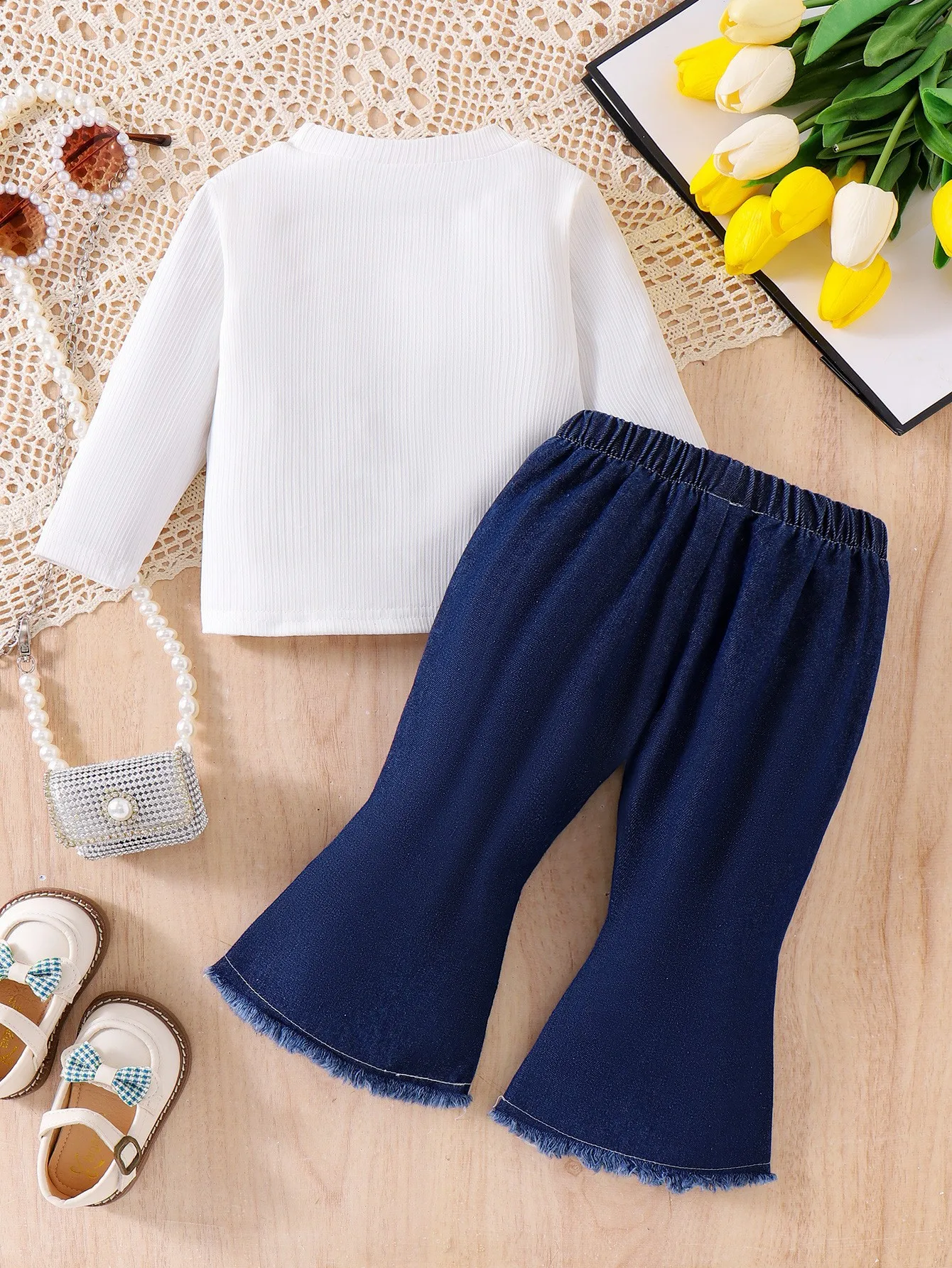 Ropa de primavera y otoño para niño niña, Tops blancos de mariposa a la moda coreana para bebé + pantalones acampanados de mezclilla con lazo, ropa de Boutique para niño B054