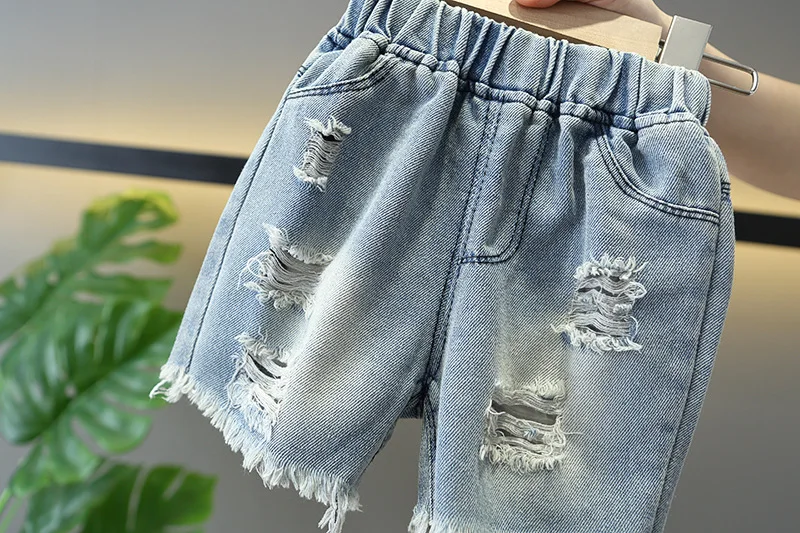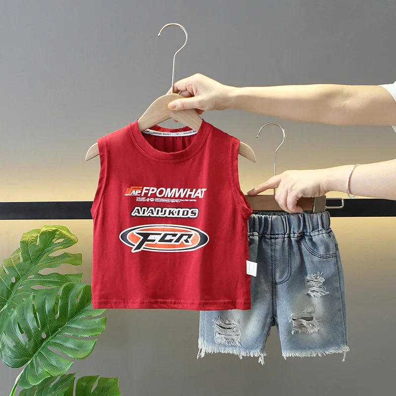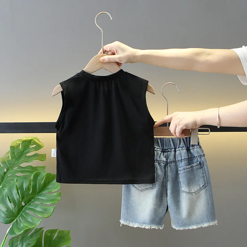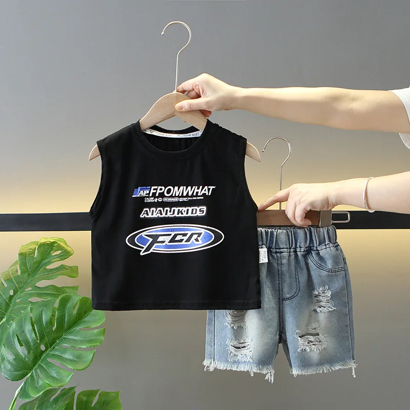 Ropa de verano de 2 piezas para niño pequeño, Tops negros sin mangas con letras a la moda coreana para bebé + pantalones cortos con agujeros de mezclilla, ropa de Boutique para niño B010