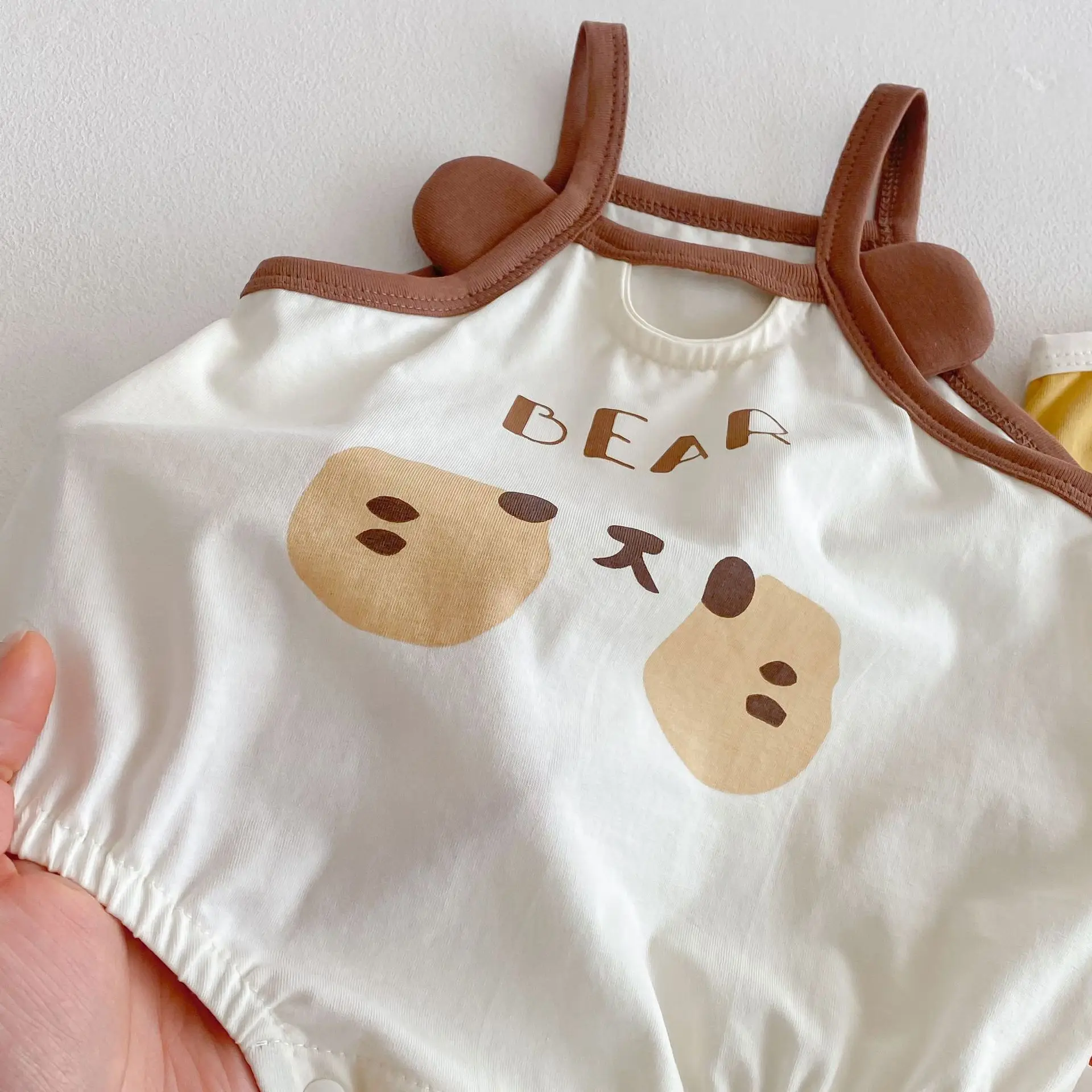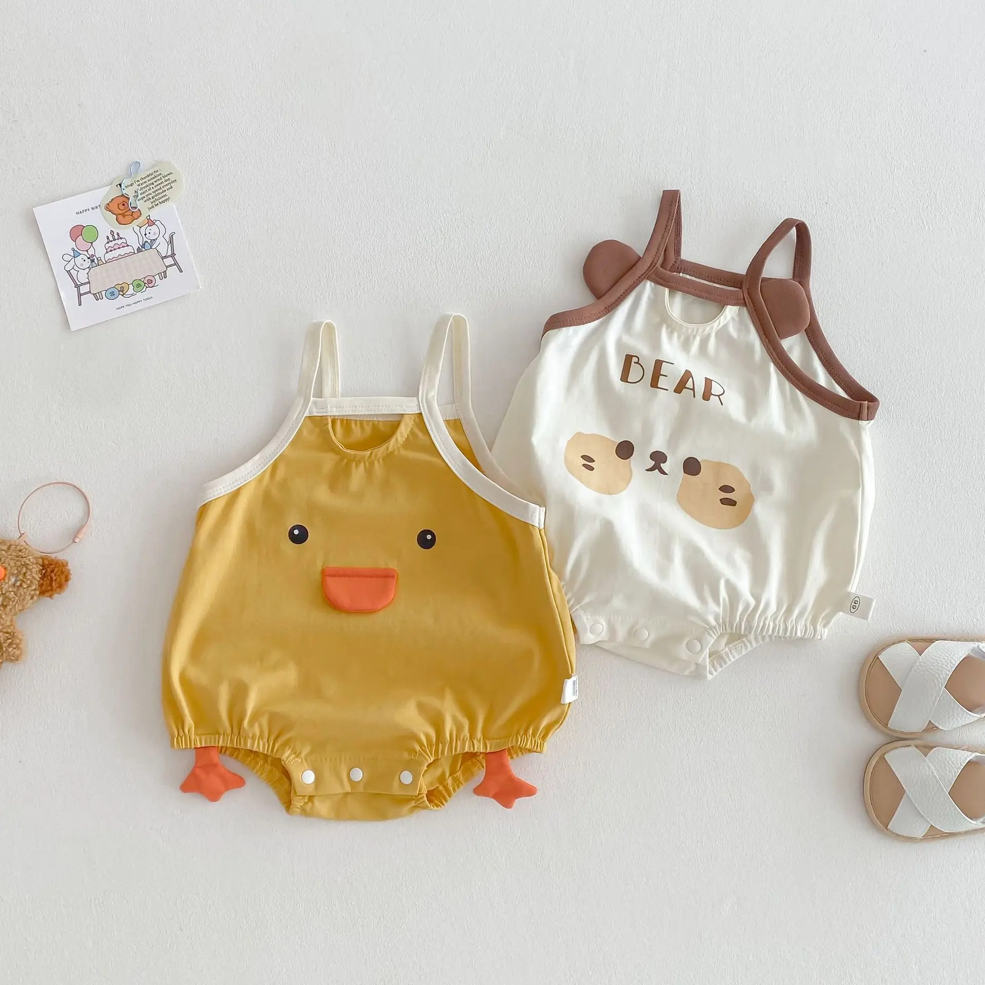 Con un encantador patrón de pollitos de dibujos animados, este mono es irresistiblemente lindo.El diseño sin mangas es perfecto para los cálidos días de verano, manteniendo a su bebé fresco y luciendo elegante.
