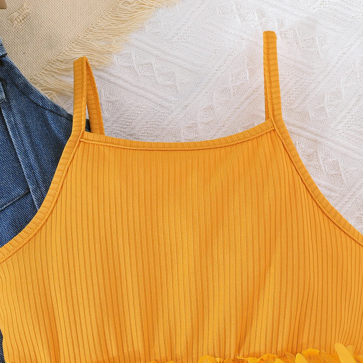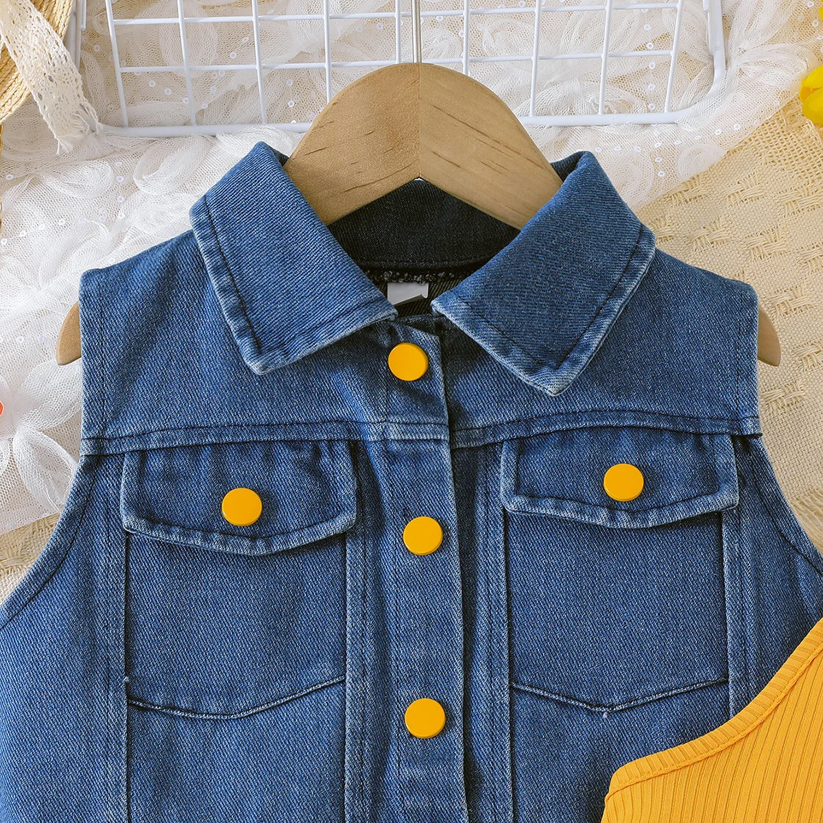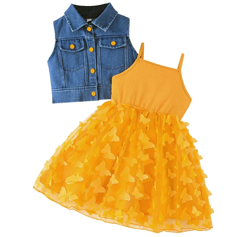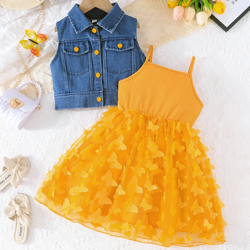 Comprar Ropa de verano para niñas, abrigo vaquero sin mangas a la moda coreana + vestido de princesa de mariposa de malla, conjuntos para niños B031, 2 piezas