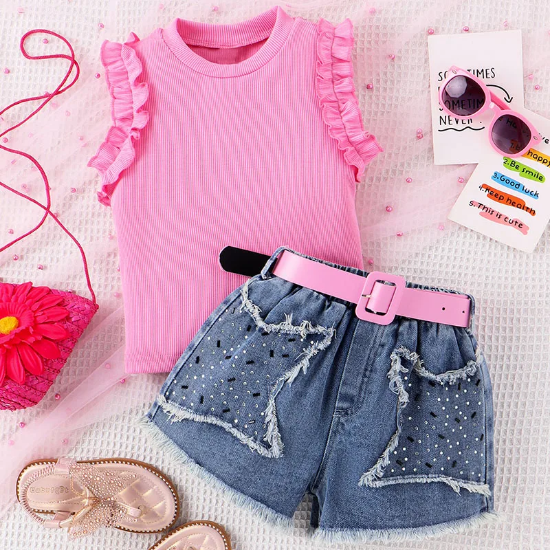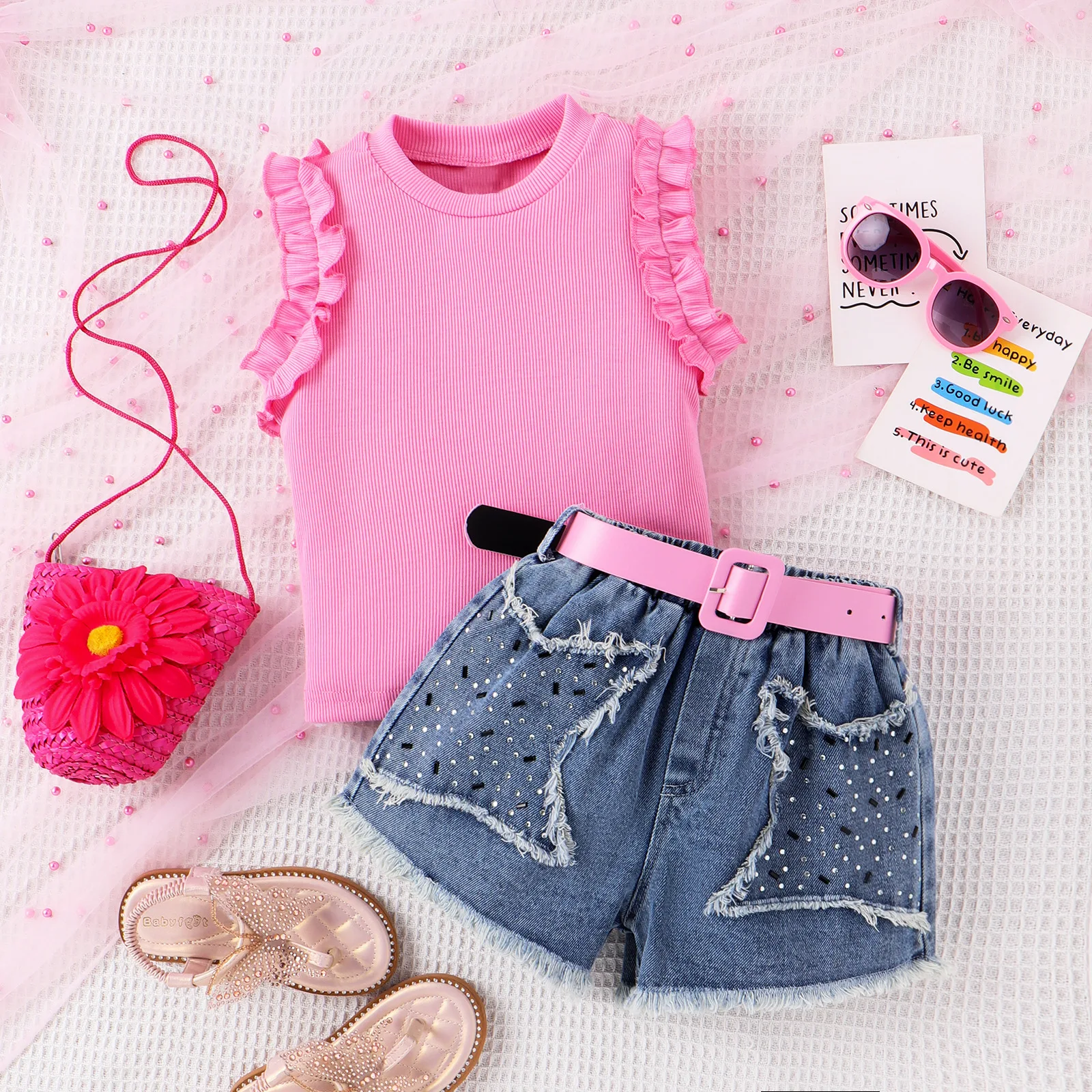 Ropa de verano para niñas pequeñas, Tops rosas sin mangas a la moda coreana, pantalones cortos vaqueros y cinturón, ropa de Boutique para niños, conjuntos para niños B052