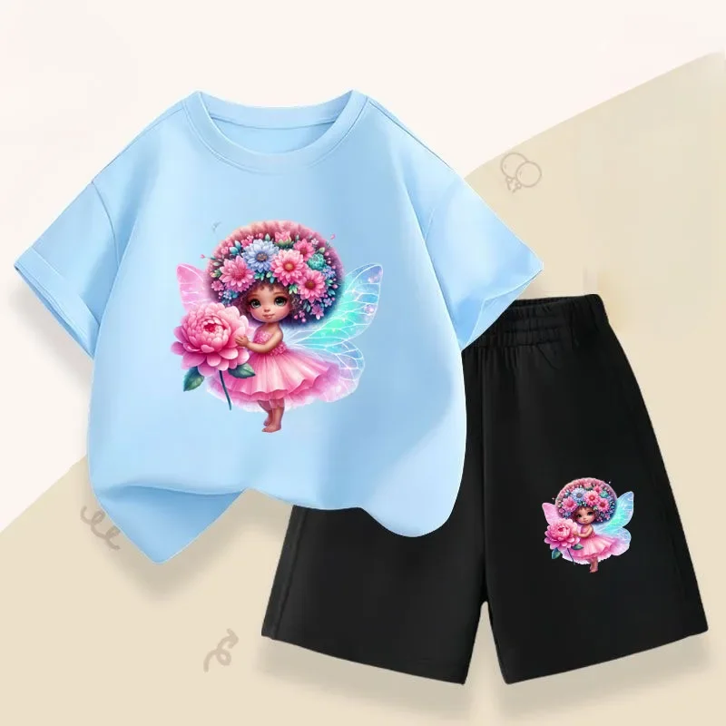 Rose Angel Girl, novedad de verano, Top de manga corta, pantalones cortos, conjunto de dos piezas, trajes informales transpirables para niños, trajes de playa para niños