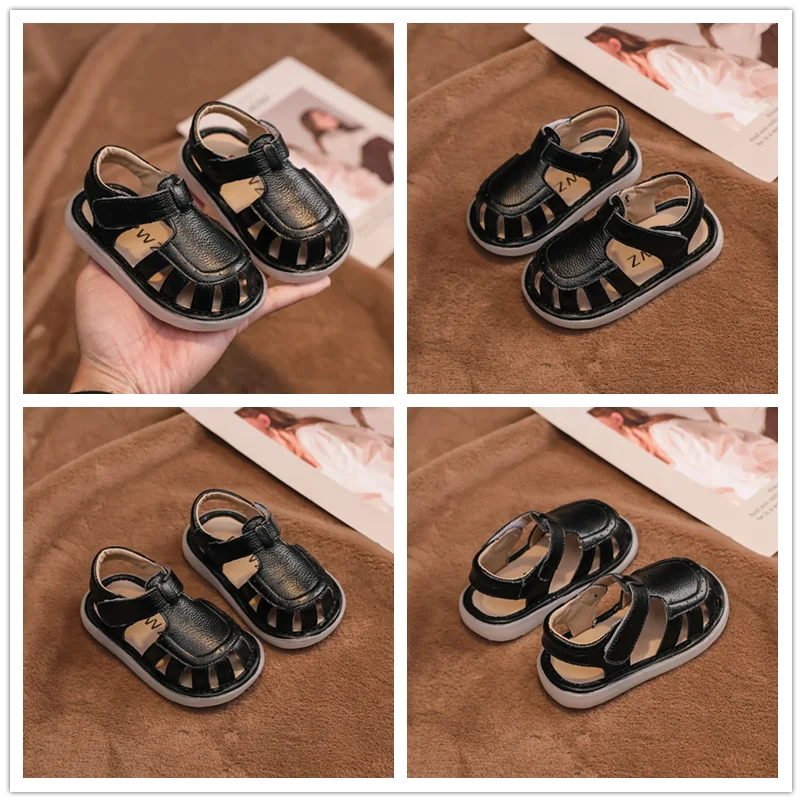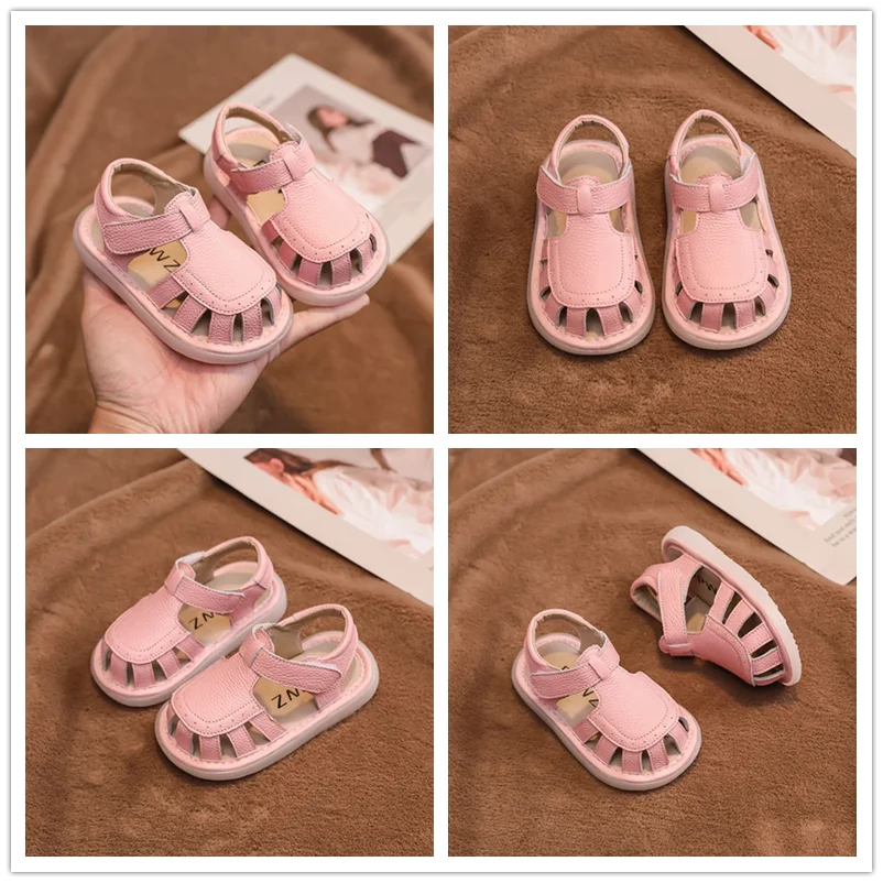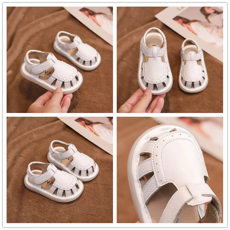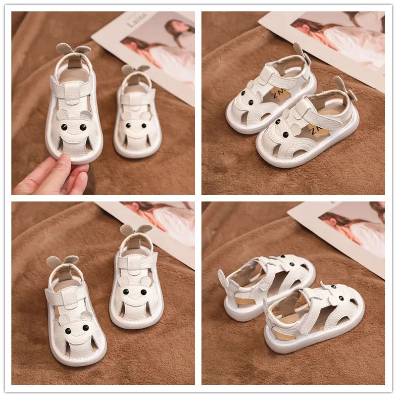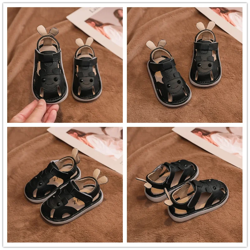 Sandalias de cuero genuino para bebés y niños, zapatos de playa de verano con dibujos animados para niños pequeños, zapatos informales antideslizantes de suela blanda
