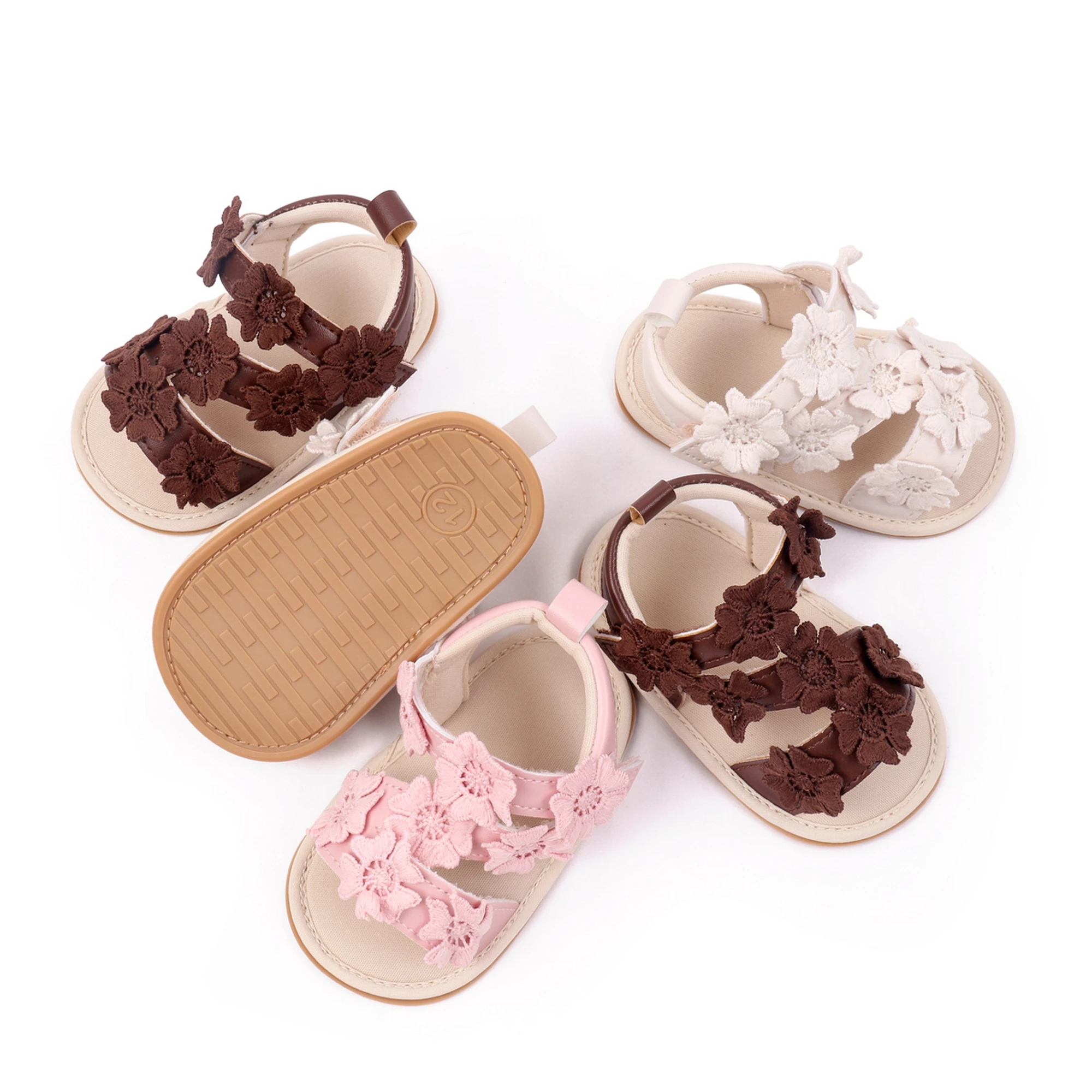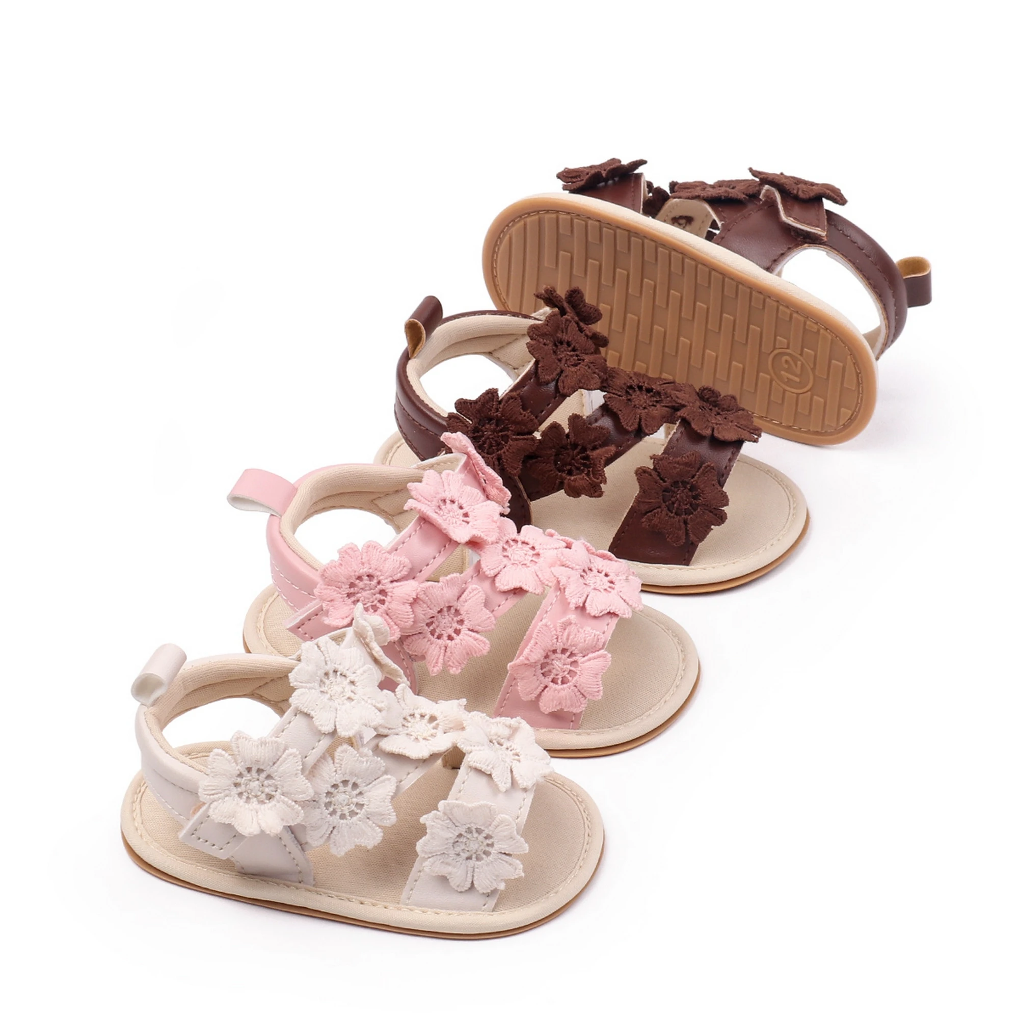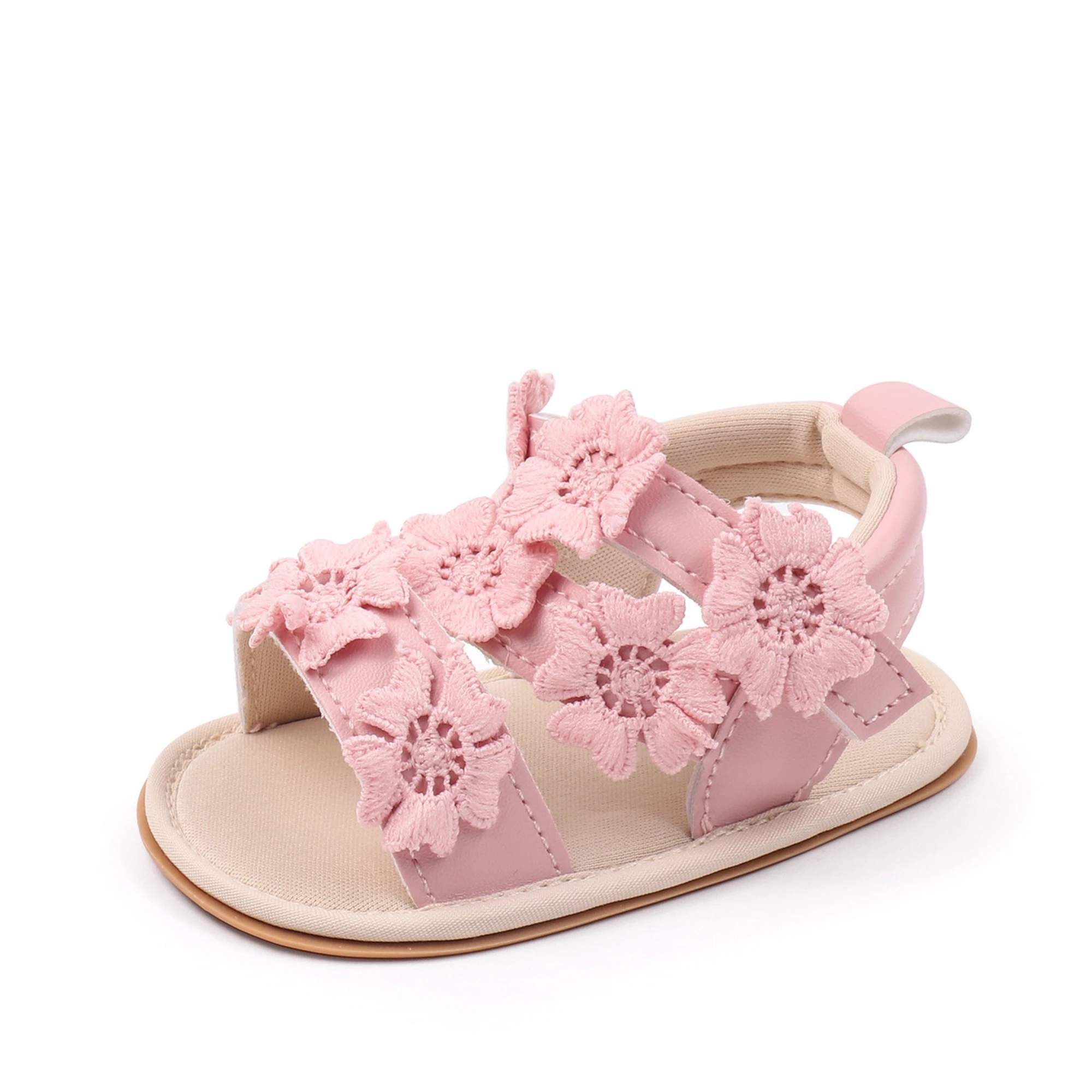Sandalias para niña, zapatos planos de verano con flores antideslizantes de cuero PU flexibles para uso diario informal