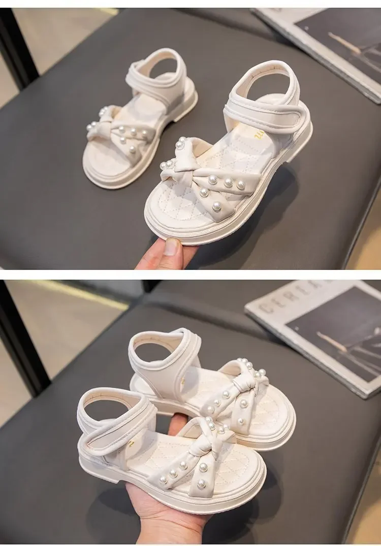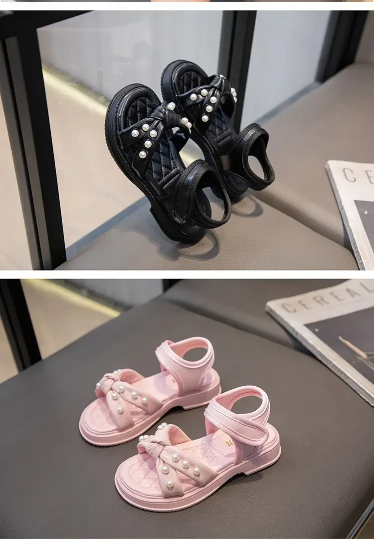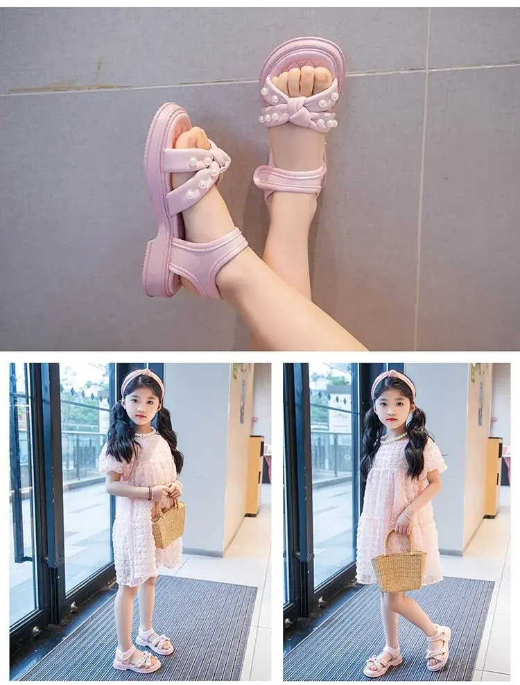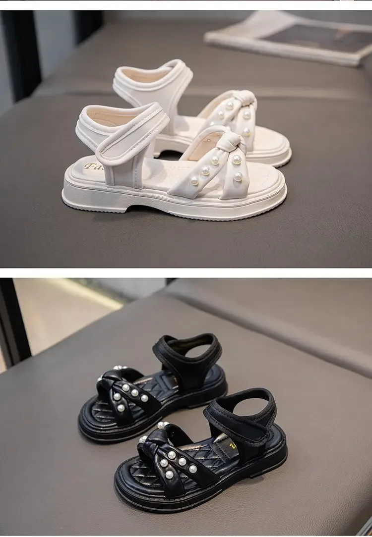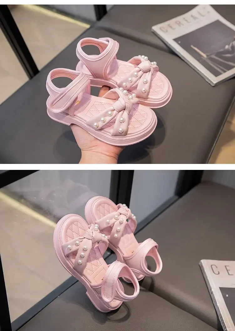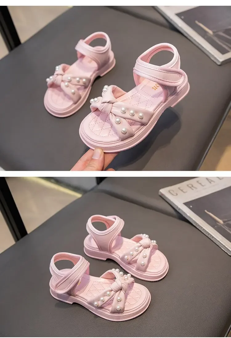 Sandalias para niñas pequeñas, novedad de verano 2025, zapatos de princesa con perlas para fiesta, boda, zapatos de playa con nudo antideslizante para vacaciones