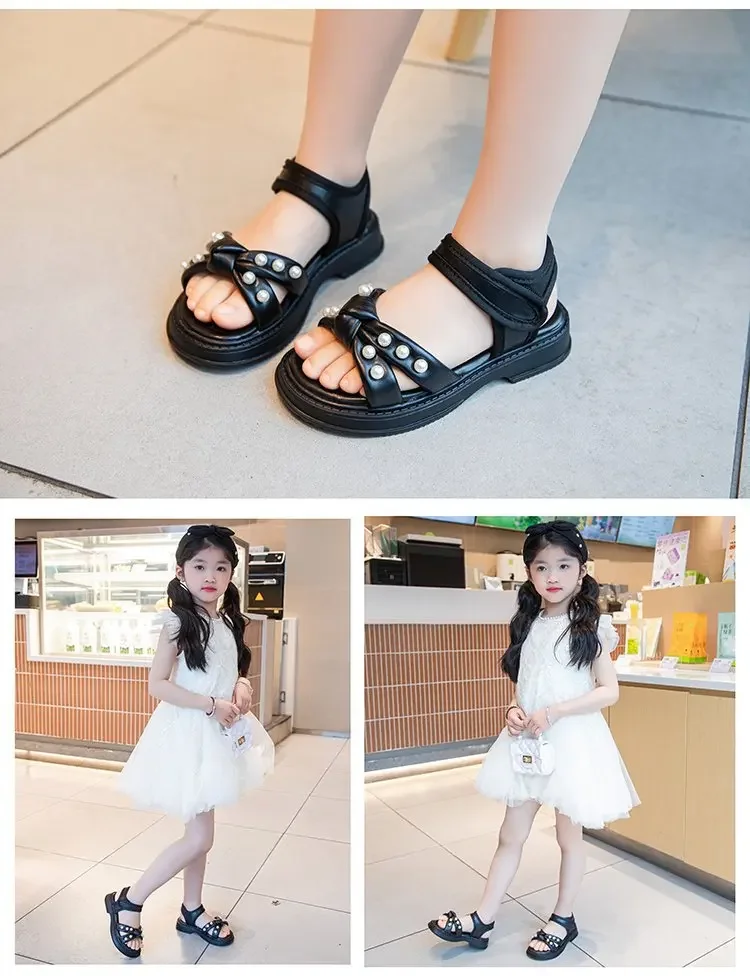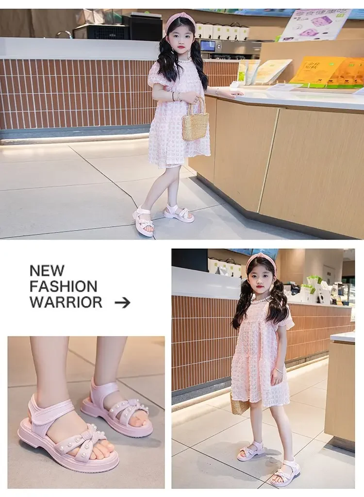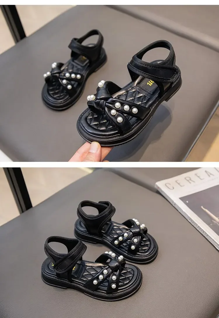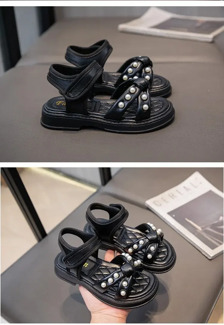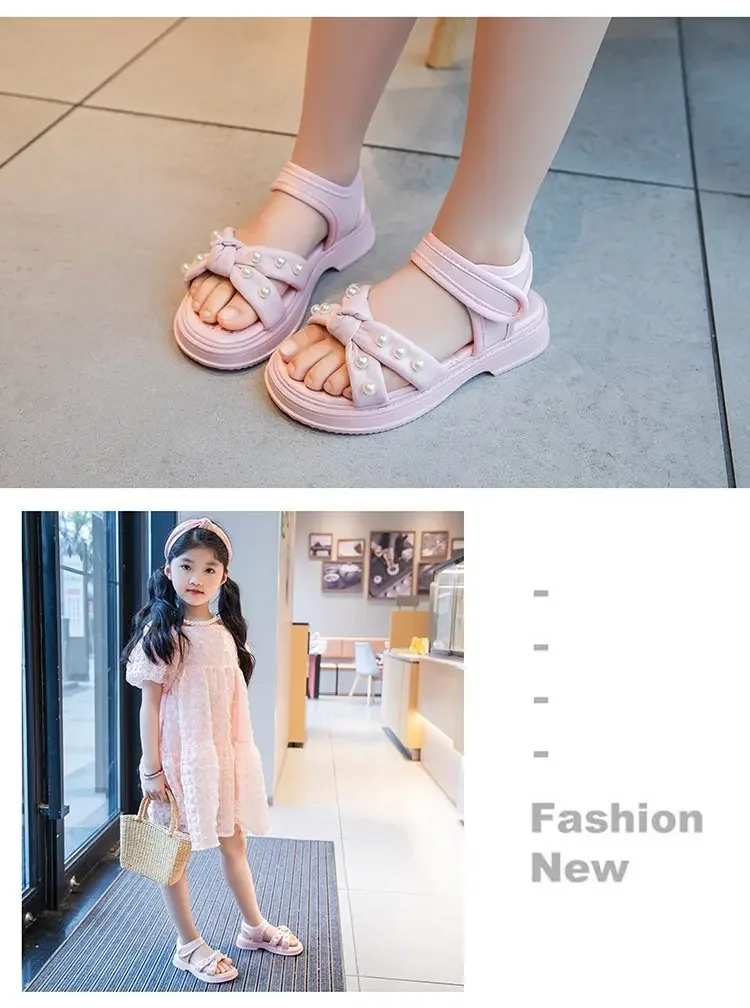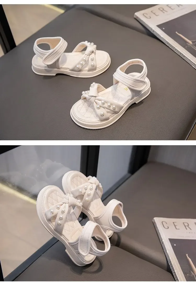 Sandalias para niñas pequeñas, novedad de verano 2025, zapatos de princesa con perlas para fiesta, boda, zapatos de playa con nudo antideslizante para vacaciones
