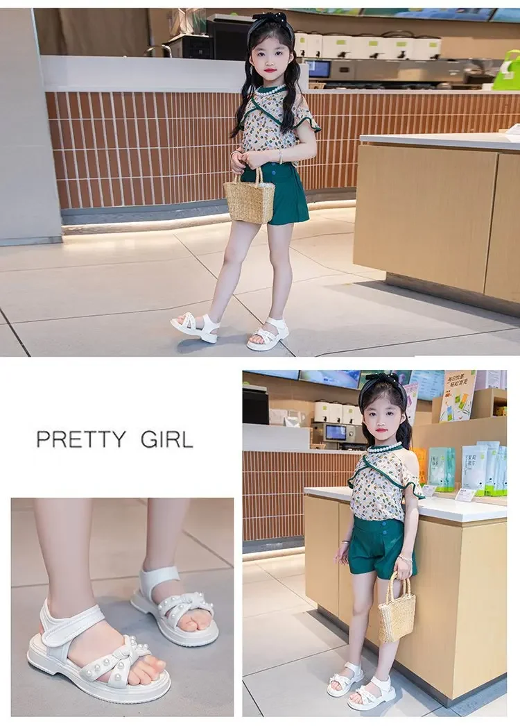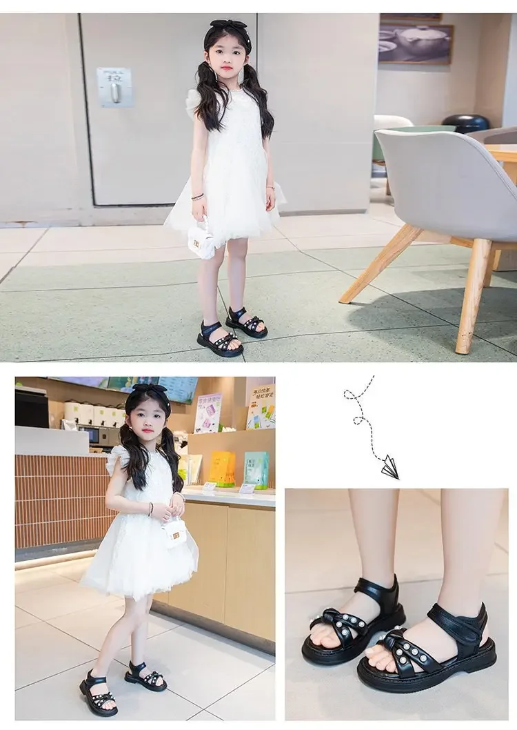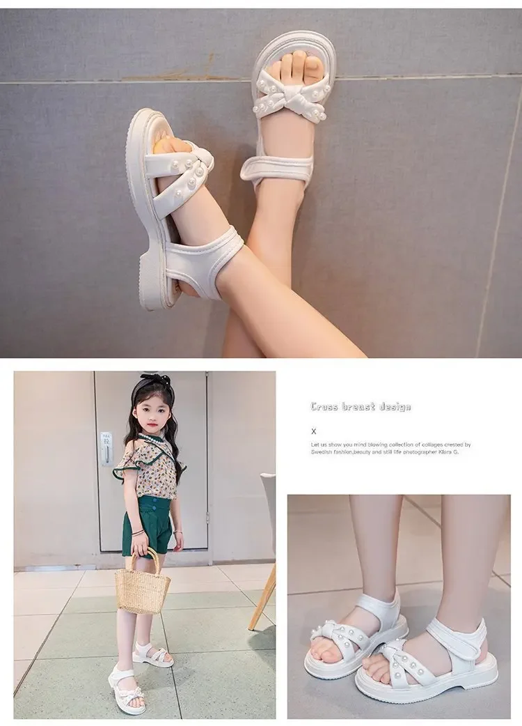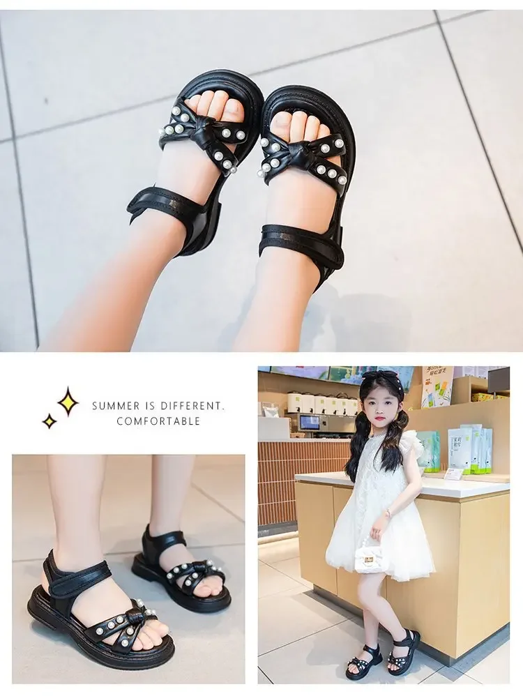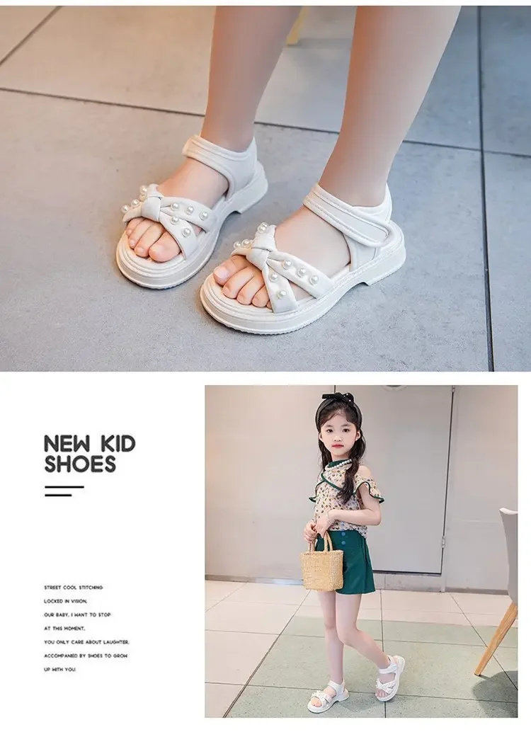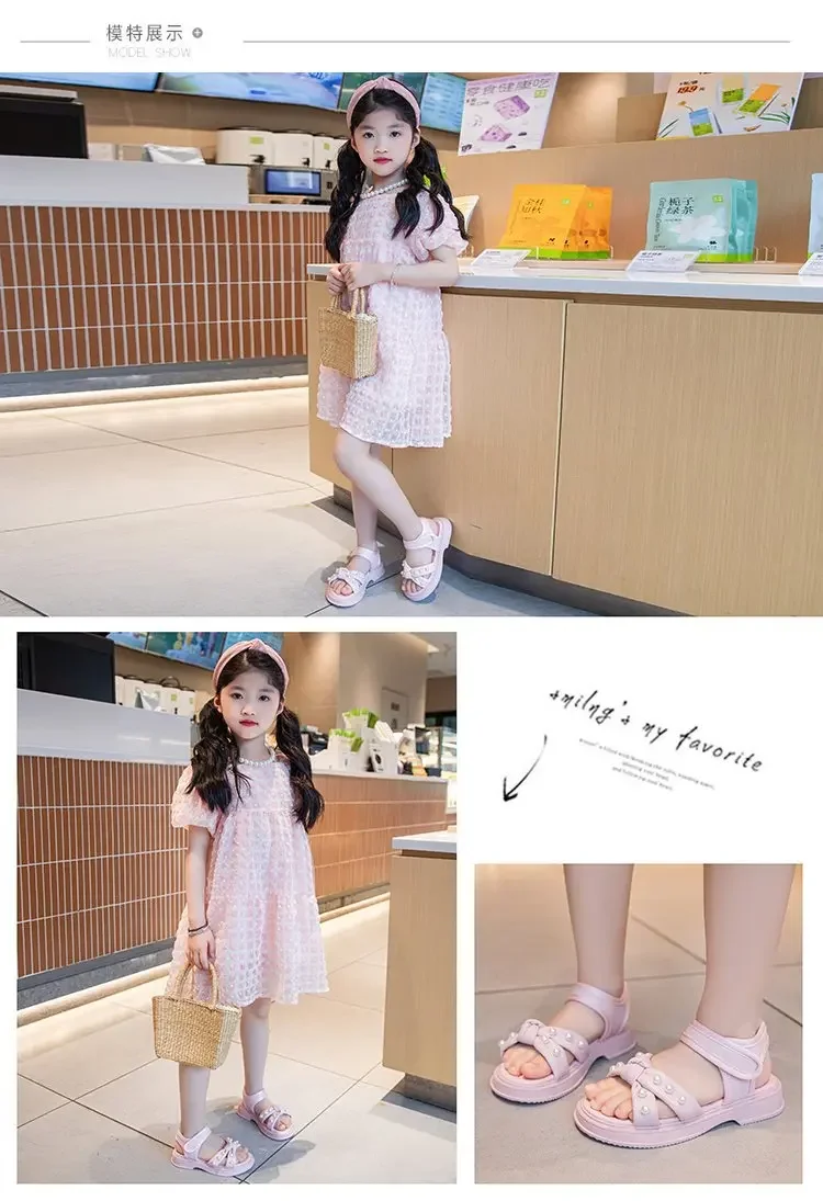 Sandalias para niñas pequeñas, novedad de verano 2025, zapatos de princesa con perlas para fiesta, boda, zapatos de playa con nudo antideslizante para vacaciones
