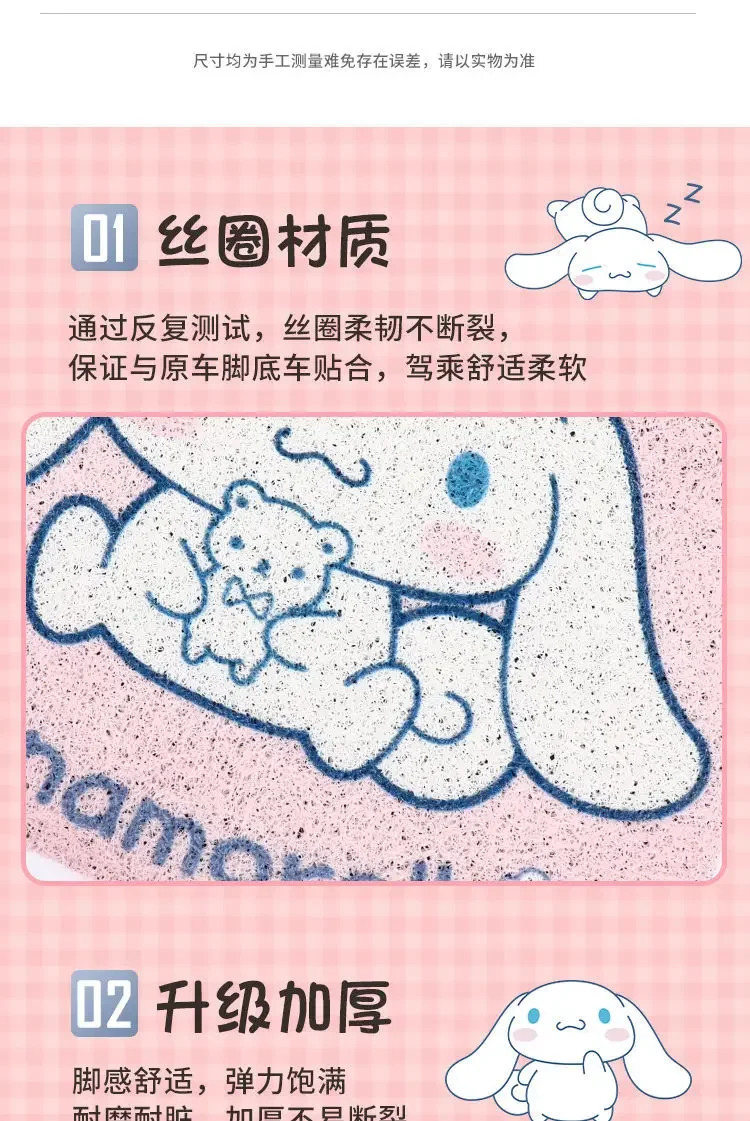 Marca: Sanrio Material: PVC + malla de alambre de poliéster (retardante de llama) ESTILO: dibujos Color: Mi melodía Color: negro Color: Cinnamoroll Tamaño del embalaje: 47cm Función: alfombrilla de coche Detalles del tamaño: Vea la imagen a continuación
