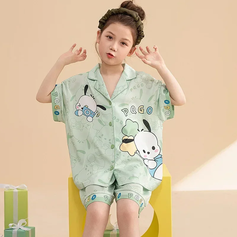 Sanrio Anime pijamas de seda de hielo para niños Hello Kitty de manga corta de verano fresco transpirable pantalones cortos de manga corta lindo corazón femenino