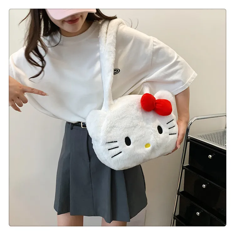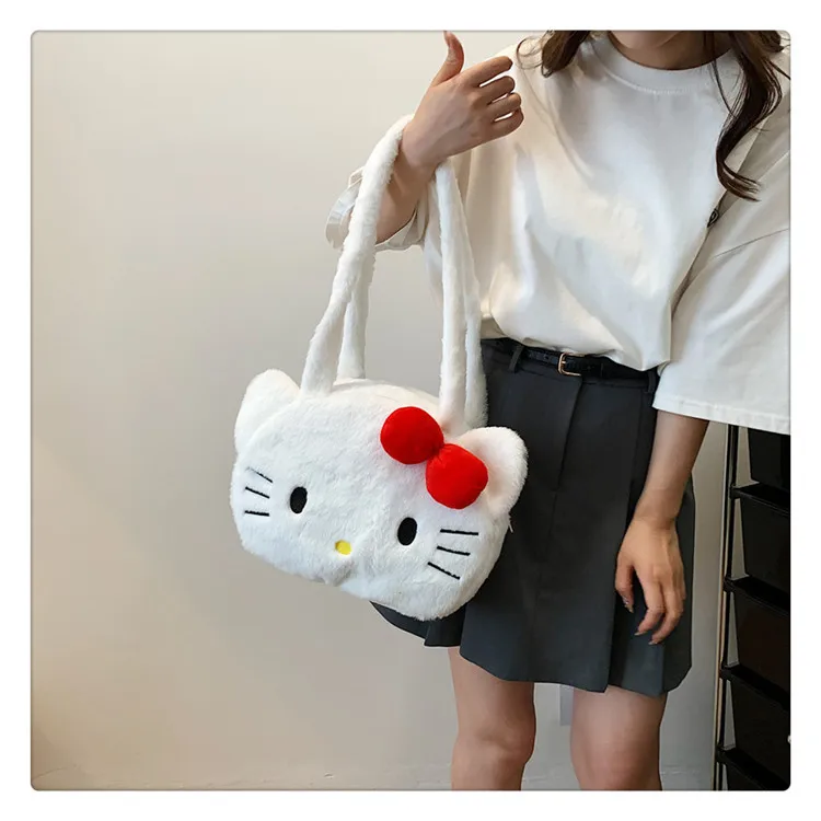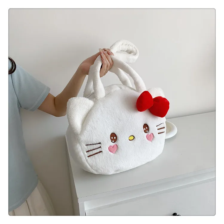 Sanrio-Bolso de mano de felpa de Hello Kitty para mujer, bonito bolso de dibujos animados para compras, comestibles, Escuela reutilizable con cremallera interior, regalo para niña