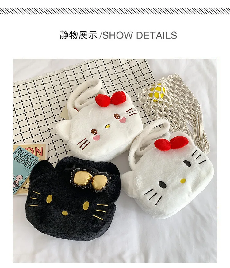 Comprar Sanrio-Bolso de mano de felpa de Hello Kitty para mujer, bonito bolso de dibujos animados para compras, comestibles, Escuela reutilizable con cremallera interior, regalo para niña