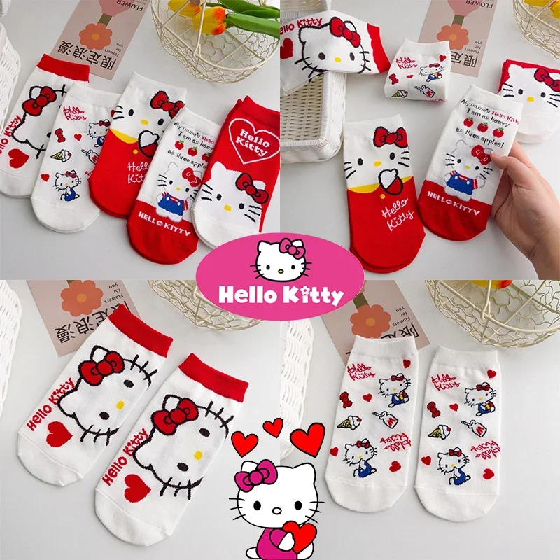 Comprar Sanrio-Calcetines de algodón con estampado de dibujos animados para mujer, medias transpirables con absorción del sudor, estilo Kawaii, Hellokitty, Verano