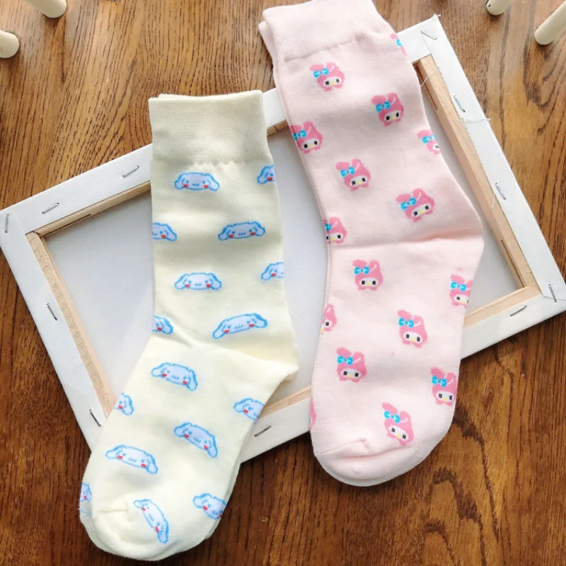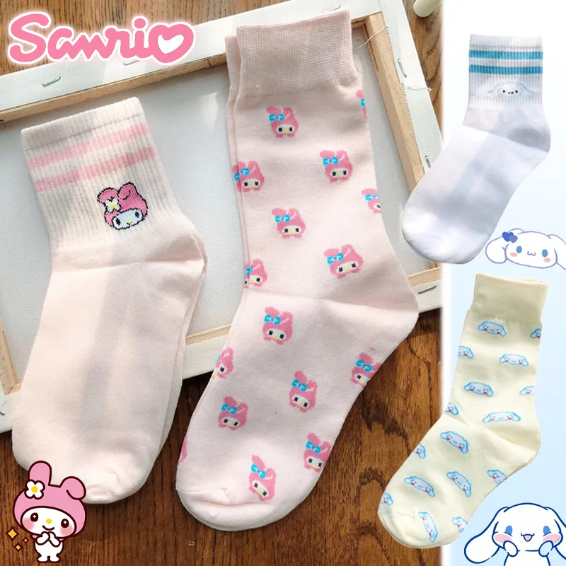 Comprar Sanrio-Calcetines cortos de dibujos animados para mujer, medias de tubo medio, transpirables, informales, estilo Harajuku Kawaii, Melody Cinnamoroll, Anime, Color caramelo