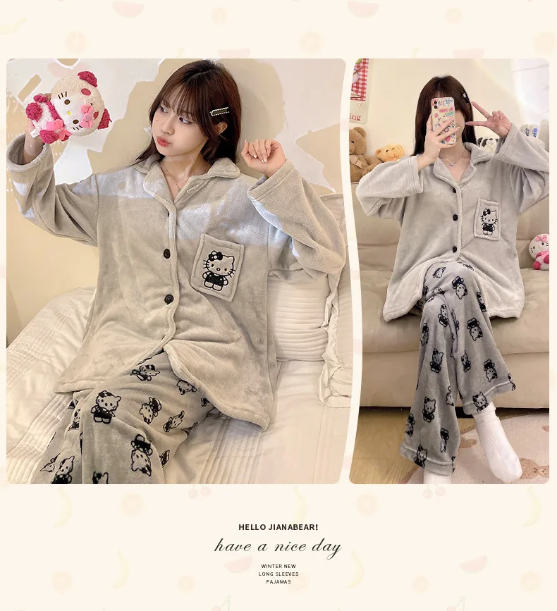 Comprar Sanrio-Conjunto de Pijama de terciopelo de Hello Kitty para mujer, conjunto de 2 piezas de terciopelo grueso acanalado, Jersey y pantalones, Invierno