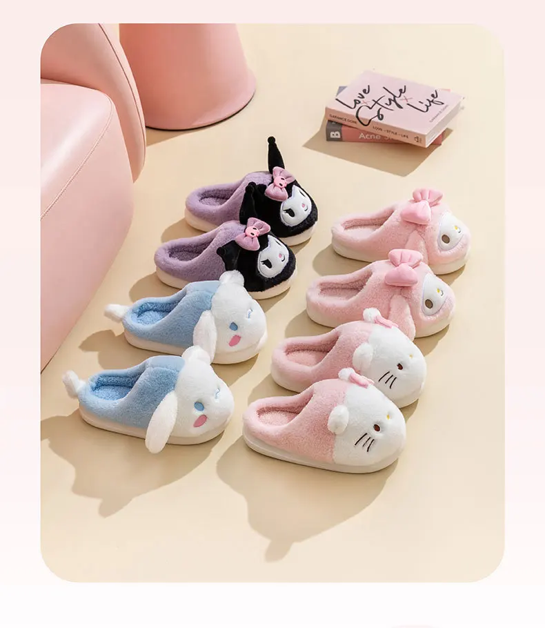 Sanrio dibujos animados Kawaii Otoño e Invierno HelloKitty Cinnamoroll Kuromi zapatillas de algodón para niños niñas gruesas Zapatillas de casa cálidas