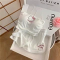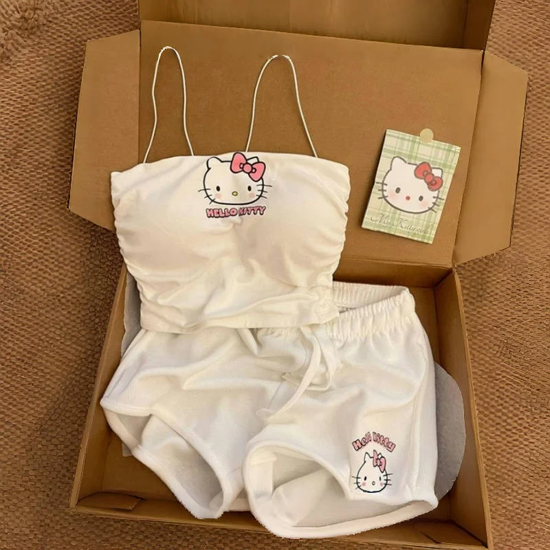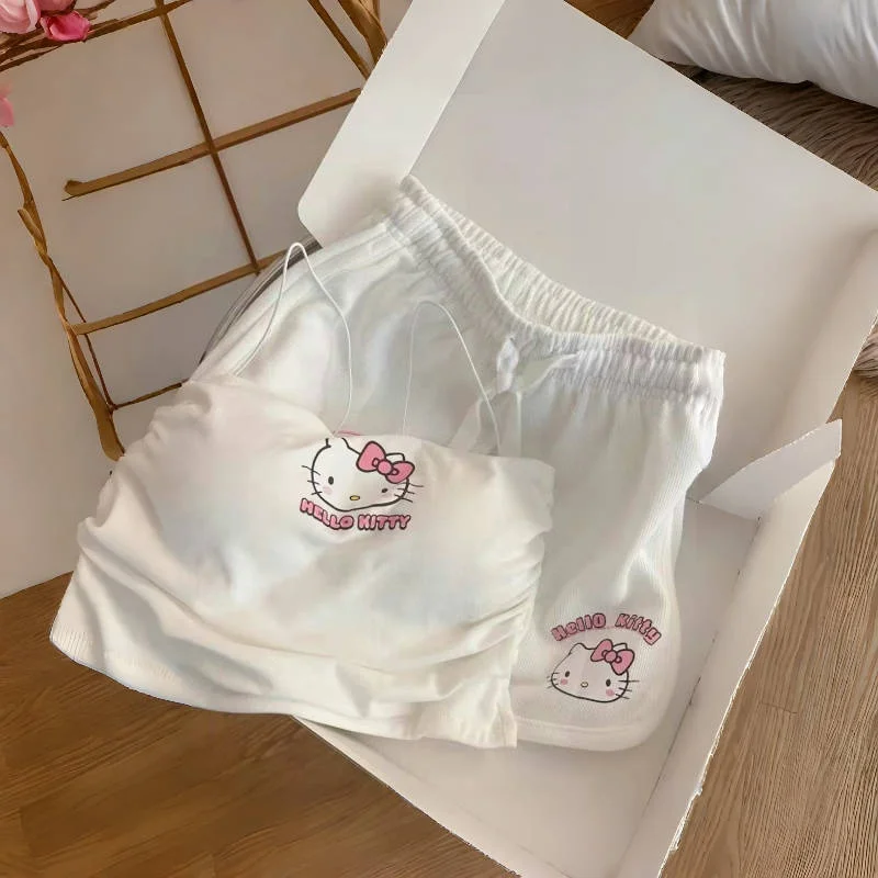 Sanrio Hello Kitty ropa de dormir con alfombrilla para el pecho chicas Kawaii primavera y verano dibujos animados Anime Correa ropa de dormir conjunto de ropa para el hogar regalo