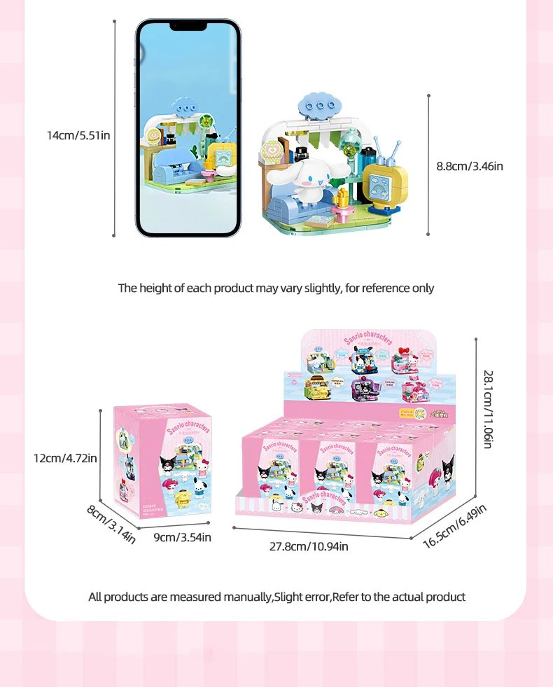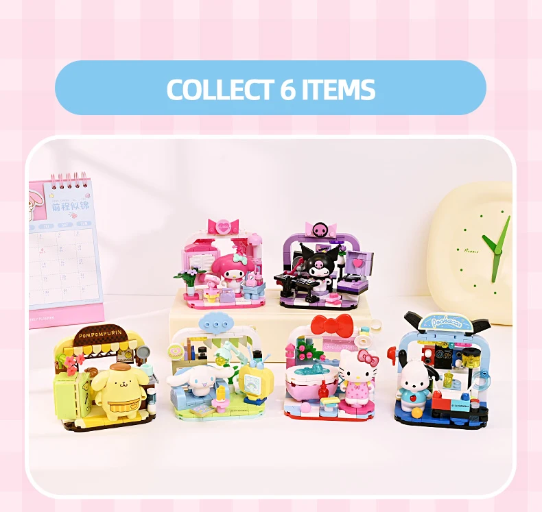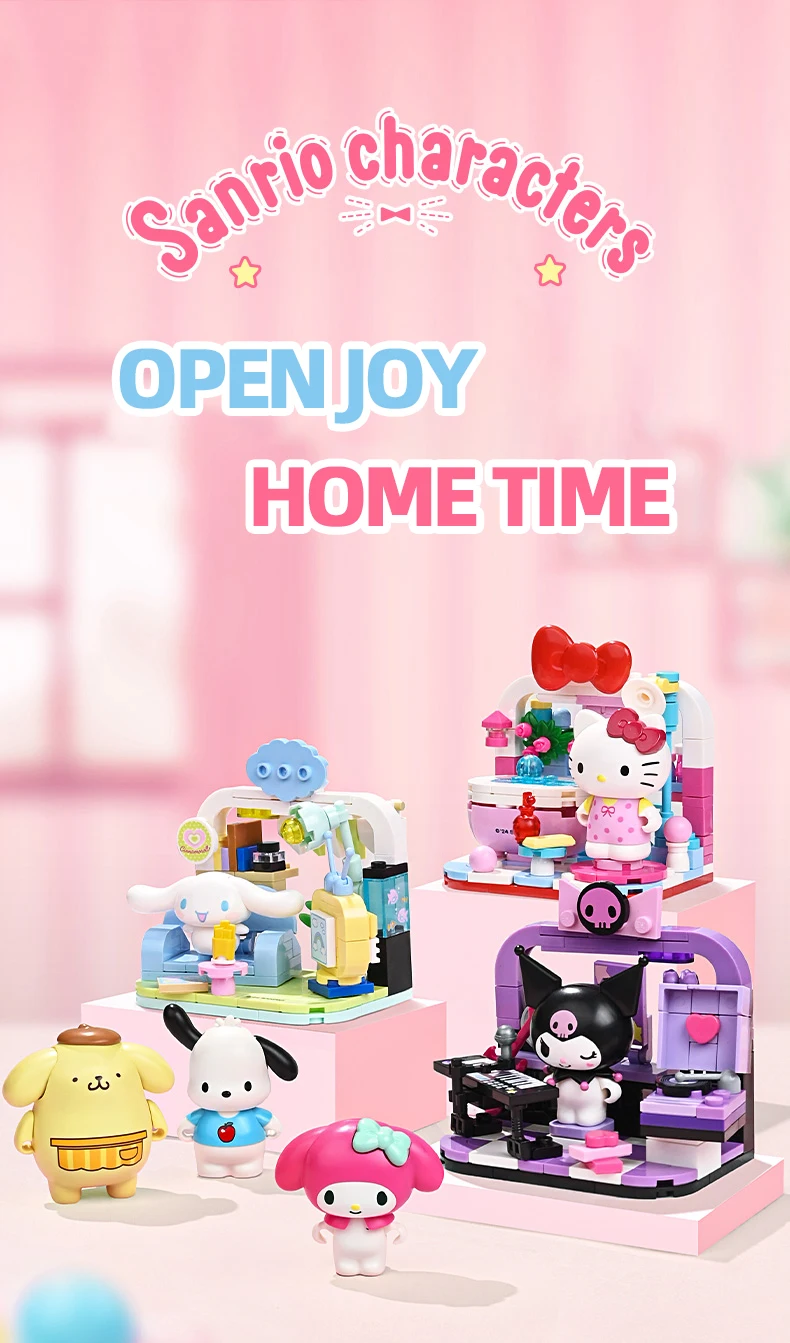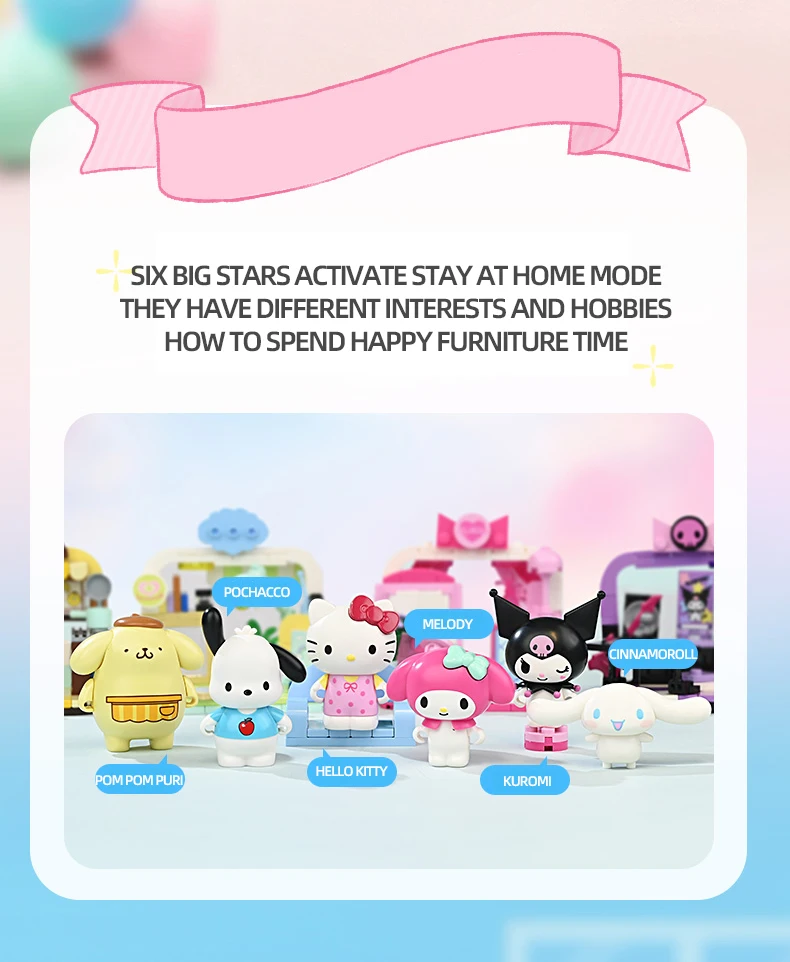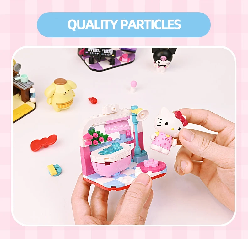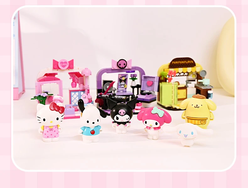 ✨Bloques de construcción con temática de Sanrio: este conjunto de bloques de construcción está inspirado en los populares personajes de Sanrio, incluidos Hello Kitty, Pochacco, Kuromi, Pom Pom Purin y más.Los niños pueden disfrutar creando sus propias escenas y aventuras de Sanrio con estos bloques coloridos y adorables.