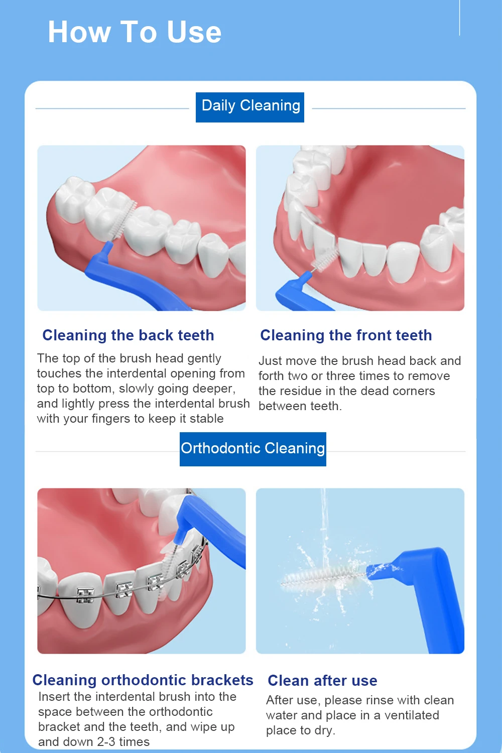* Limpieza de los dientes posteriores: la parte superior del cabezal del cepillo toca suavemente la abertura interdental de arriba a abajo, avanzando lentamente más profundamente y presione ligeramente el cepillo interdental con los dedos para mantenerlo estable.