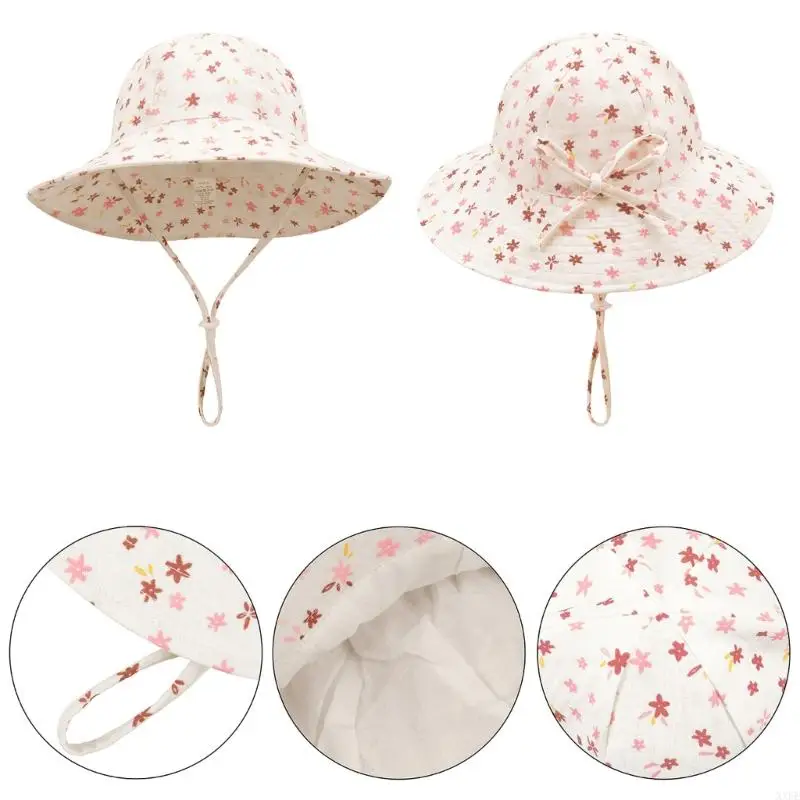 Comprar Sombrero de muselina de algodón transpirable de verano para bebé, sombrero de pescador de playa con estampado ajustable para niños de 6 a 12 meses, gorra de cubo para exteriores para bebé
