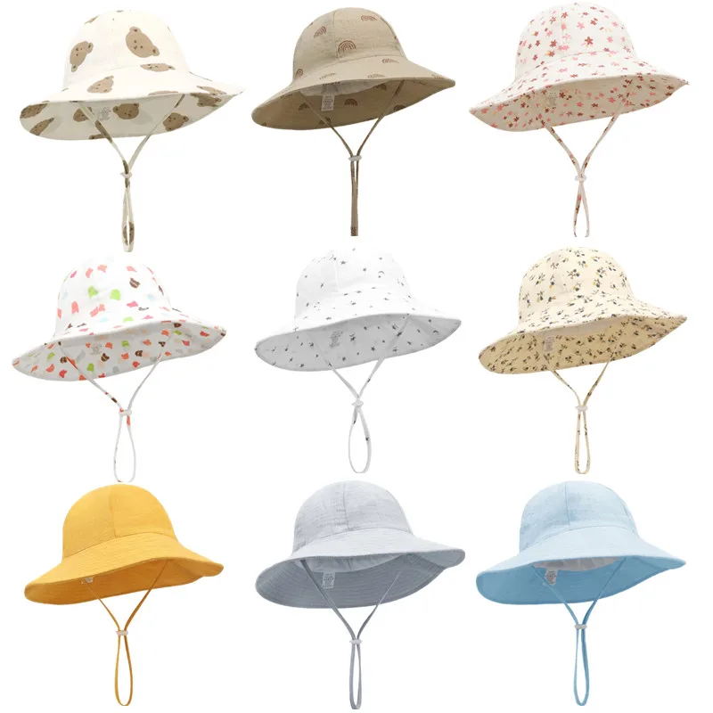 Comprar Sombrero de muselina de algodón transpirable de verano para bebé, sombrero de pescador de playa con estampado ajustable para niños de 6 a 12 meses, gorra de cubo para exteriores para bebé