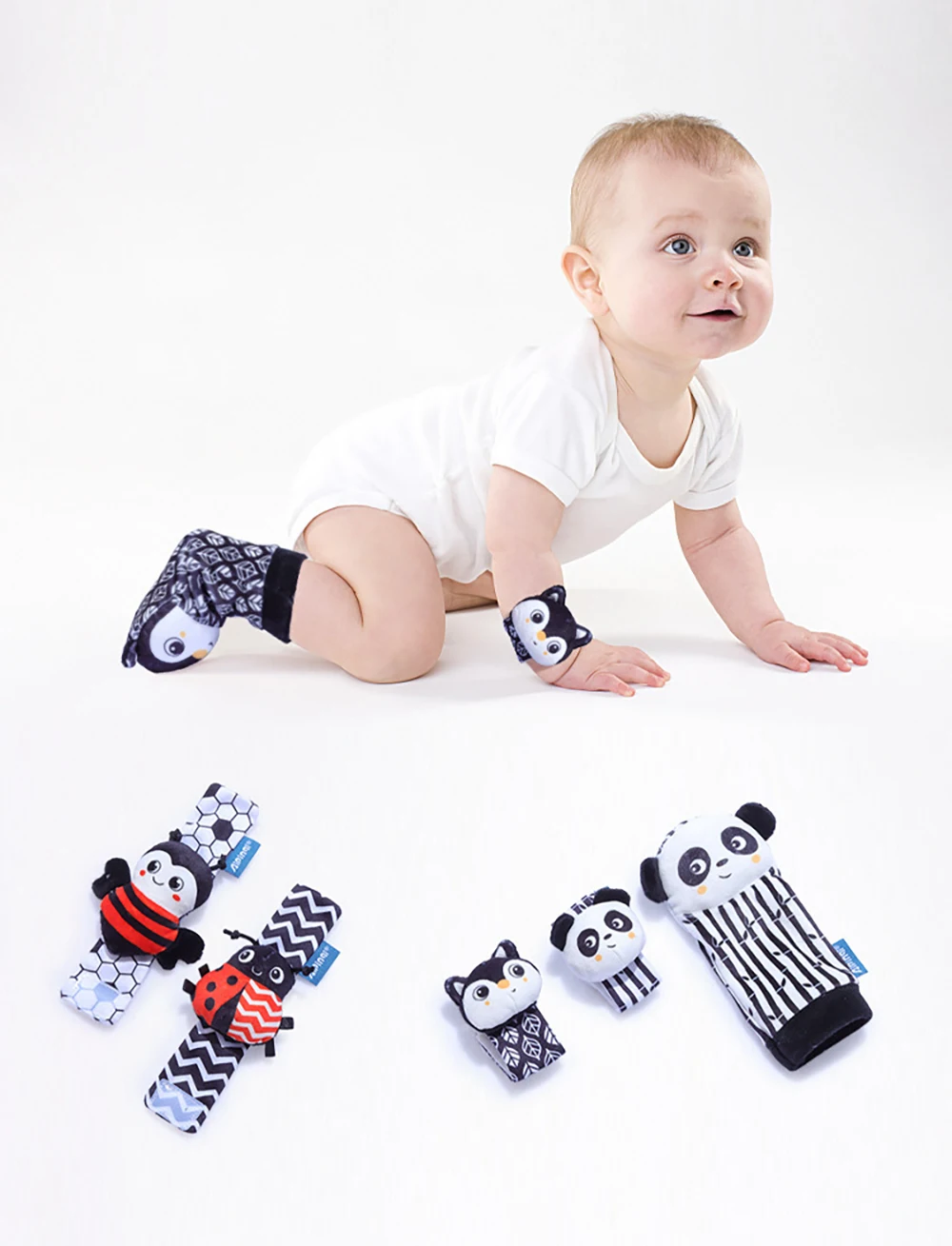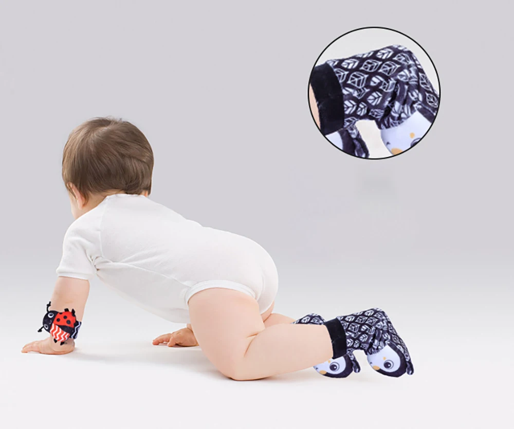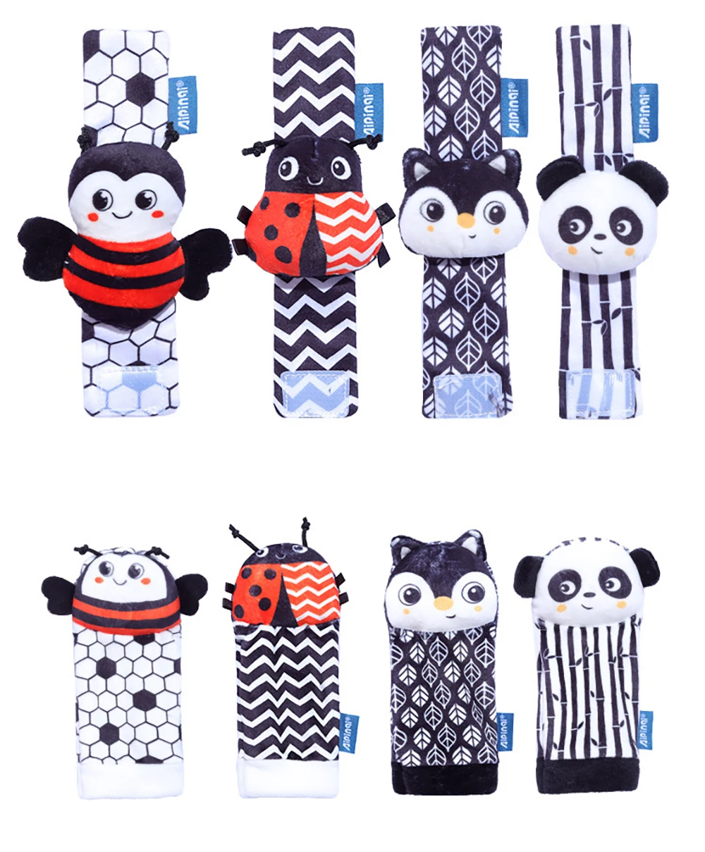 Materiales suaves y seguros para bebés: estos calcetines buscadores de pies con sonajeros de muñeca para bebés están hechos de tela de algodón de alta calidad con relleno de felpa ecológico, agradable para la piel y no tóxico, lavables y sin decoloración, perfectamente seguros y cómodos para que lo usen entre 0 y 12 meses. Recién nacidos y bebés.