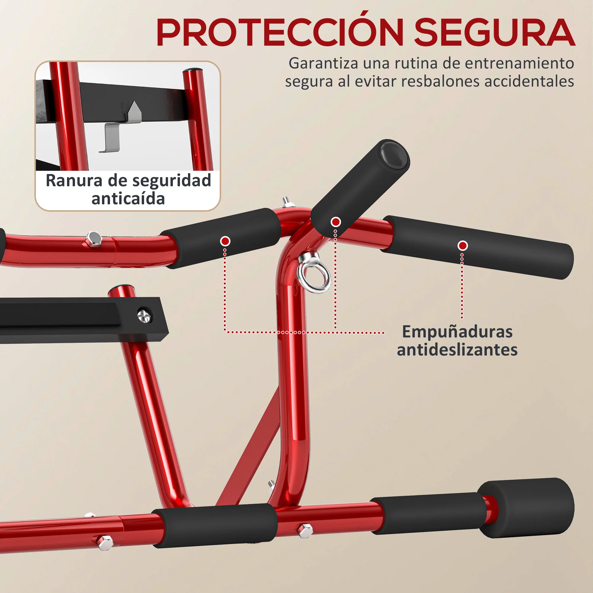 ● Barra para dominadas con estructura de acero resistente que soporta hasta 150 kg, ideal para un uso intensivo