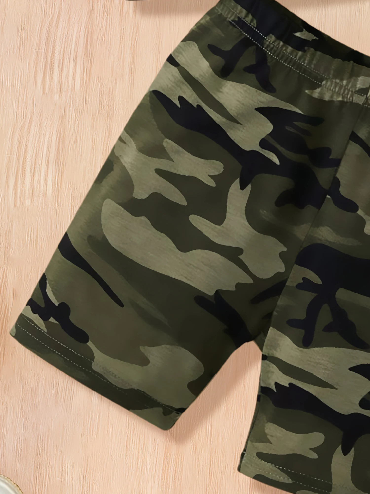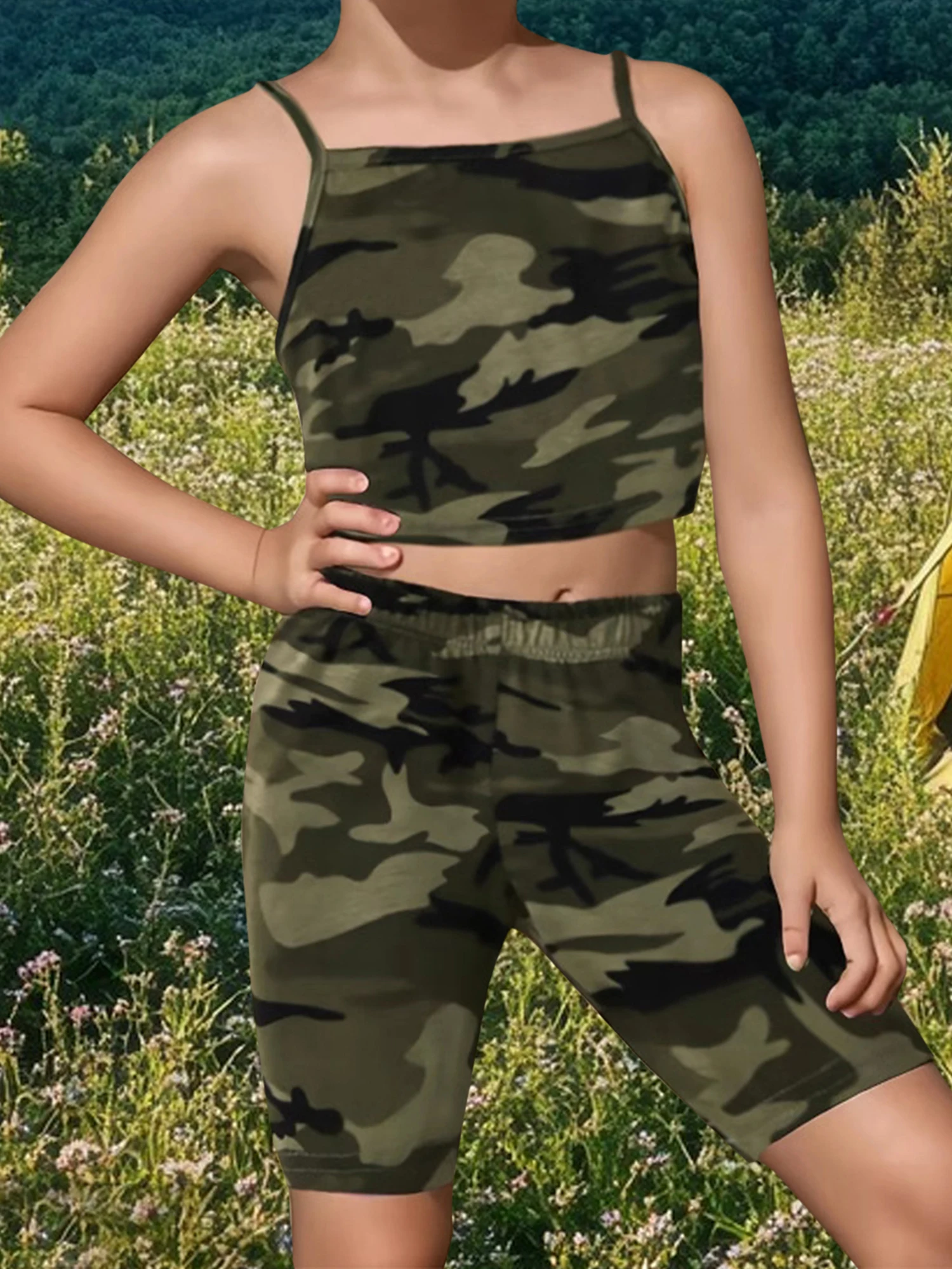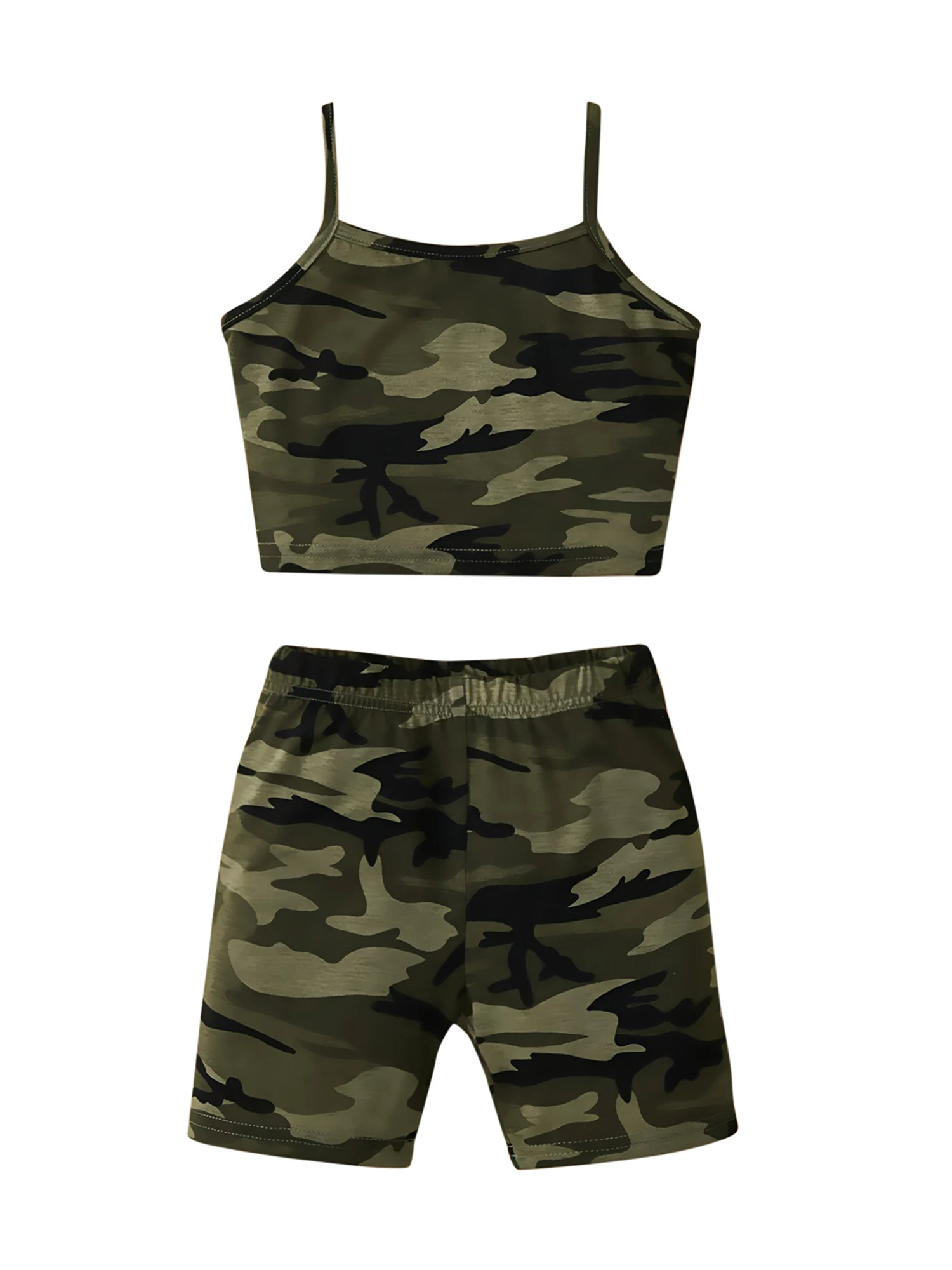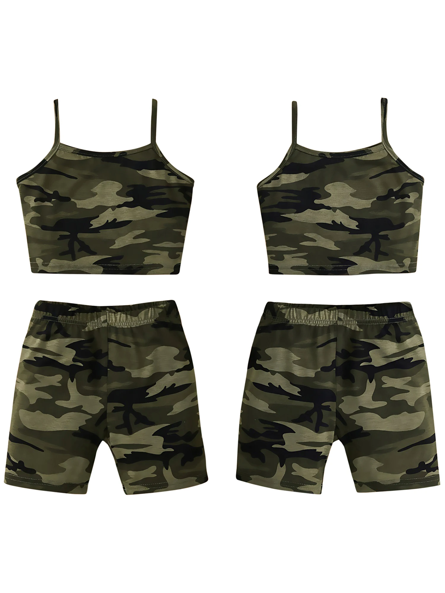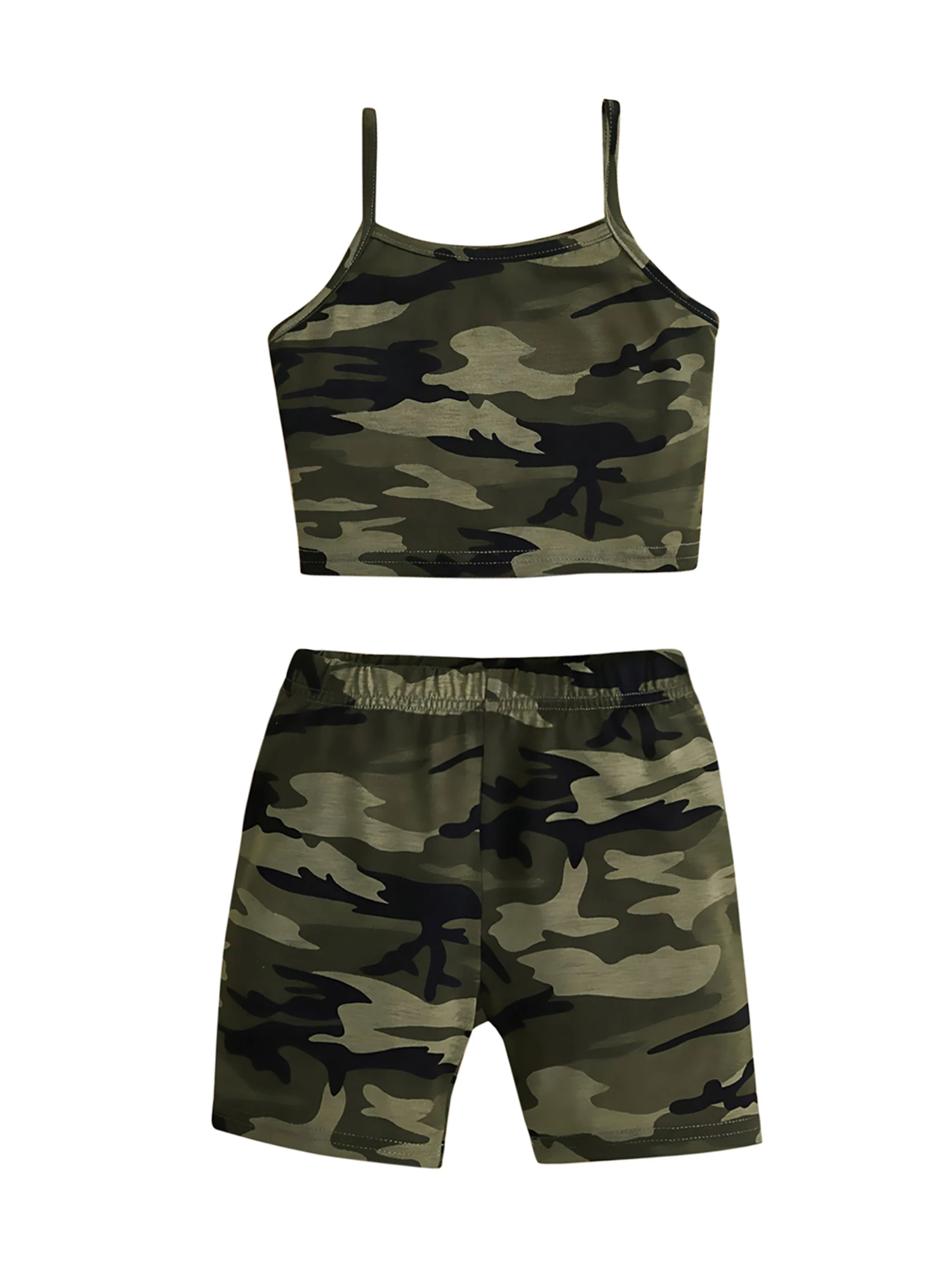 Conjunto de 2 piezas de trajes de verano para niña, sin mangas, estampado de camuflaje, camisola + pantalones cortos, ropa para niños