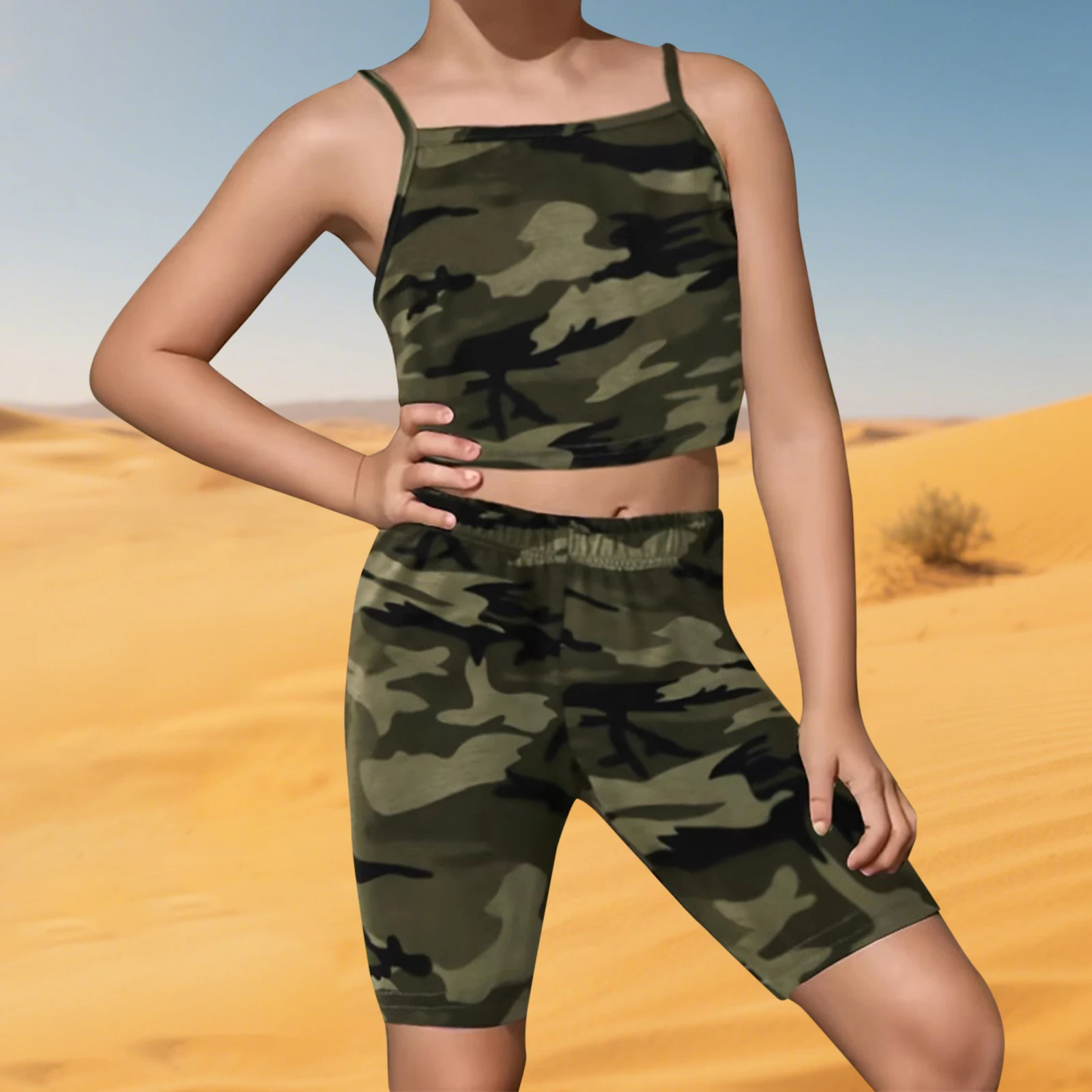 Conjunto de 2 piezas de trajes de verano para niña, sin mangas, estampado de camuflaje, camisola + pantalones cortos, ropa para niños