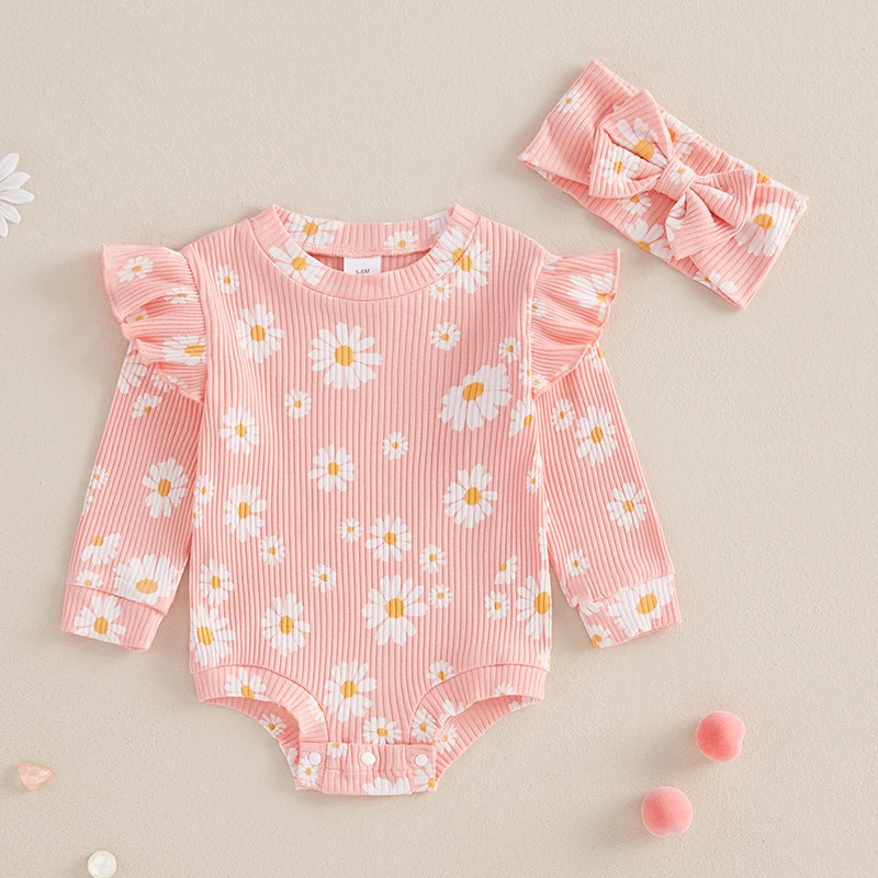 Conjunto de 2 piezas con estampado de margaritas y volantes para niña, mono acanalado de manga larga con lazo, diadema