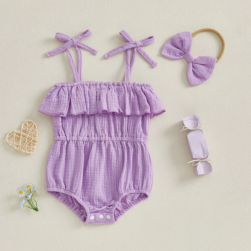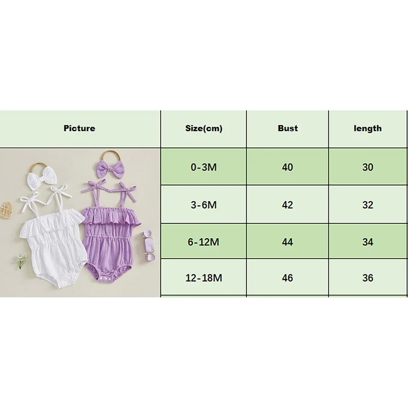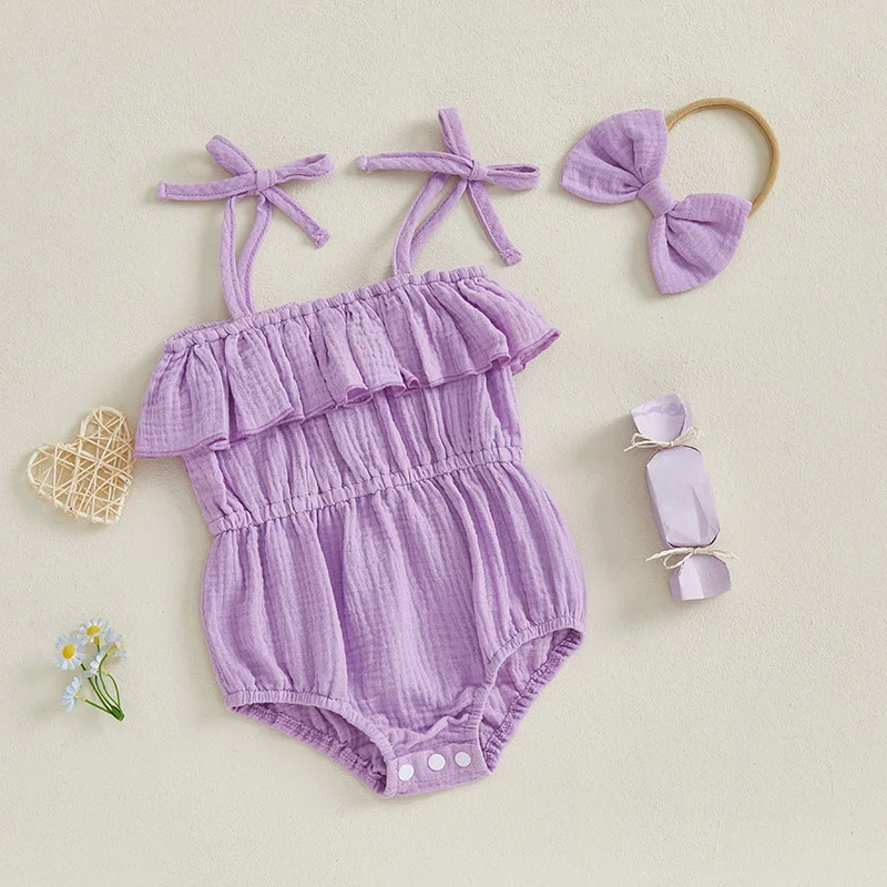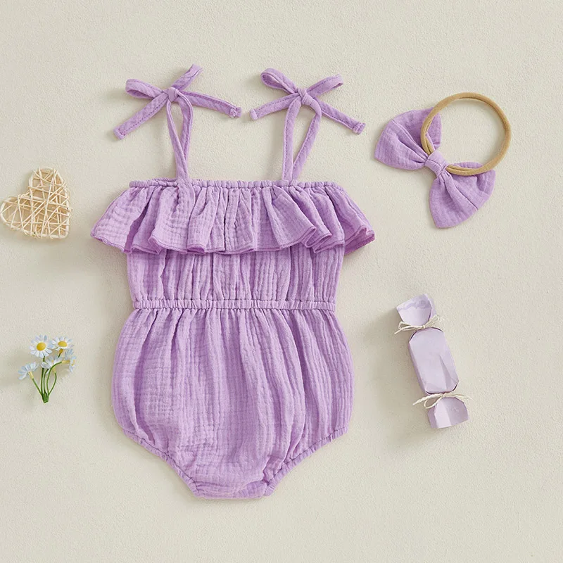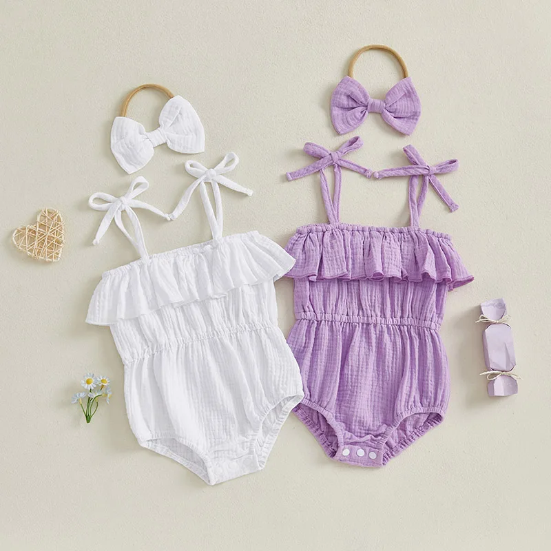 Body sin mangas con volantes para niña, pelele con lazo de Color sólido y diadema con lazo, ropa bonita de verano