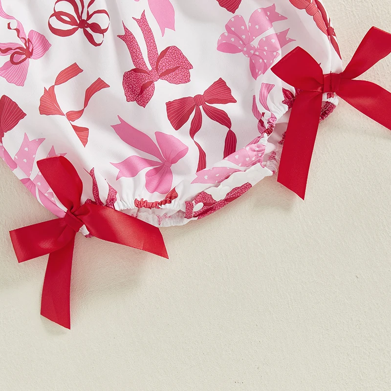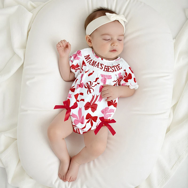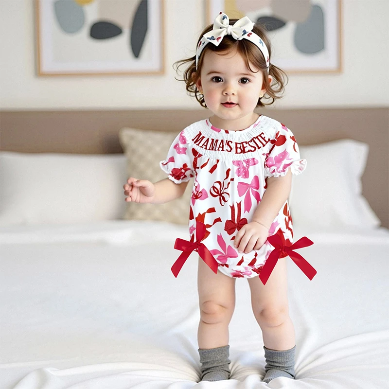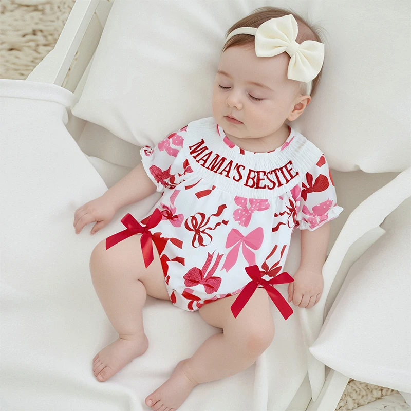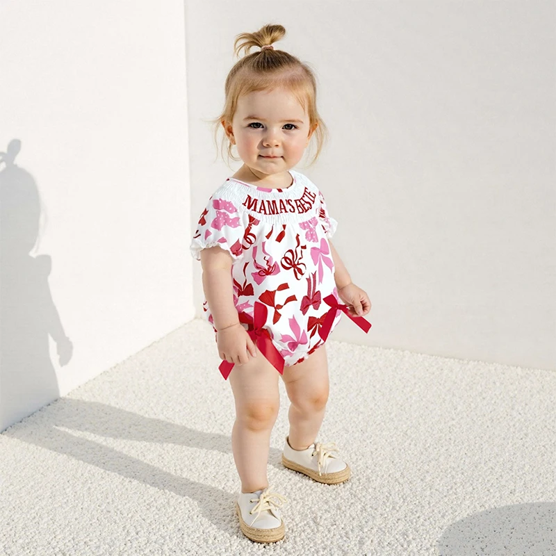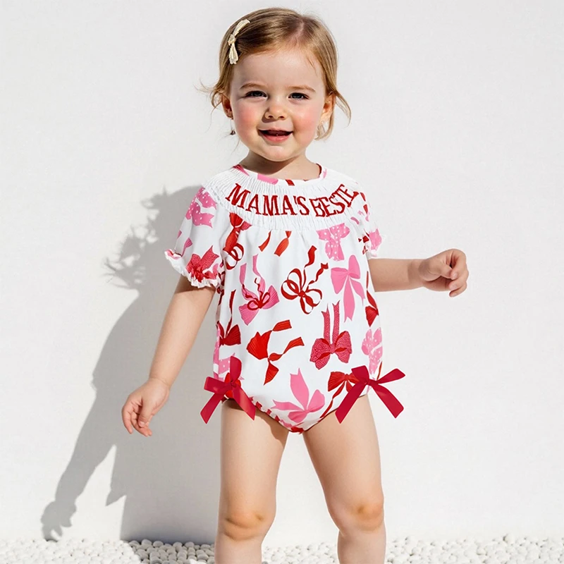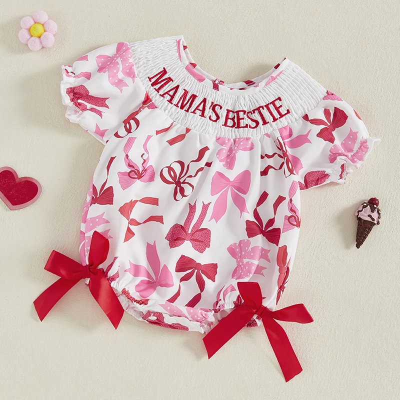 Mamelucos para niñas con letras bordadas y estampado de lazo, cuello redondo, manga corta, monos infantiles