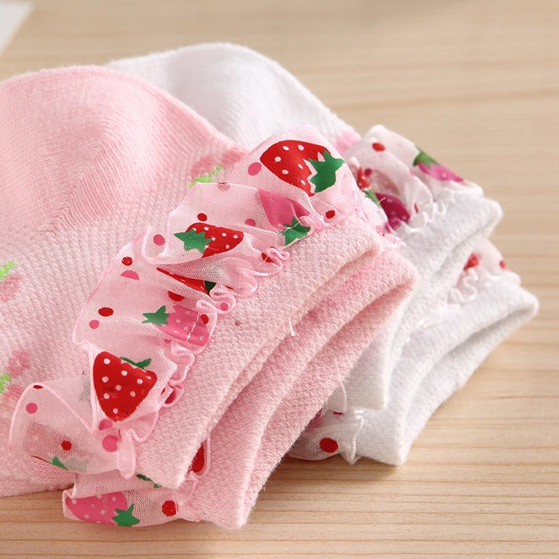 Comprar Suefunskry-calcetines tobilleros con estampado de fresas para niña, medias transpirables de encaje con volantes, para verano