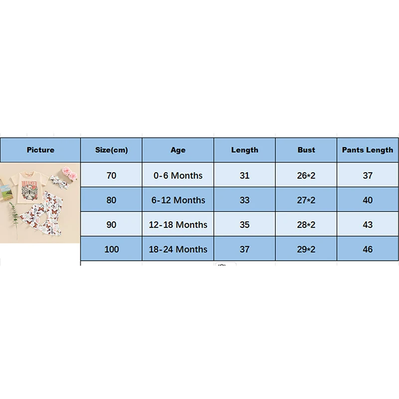 Conjunto de moda para niñas con estampado de mariposas. Camiseta de bebé niña Top con cuello redondo y diseño de manga corta. Pantalones Acampanados para niña con diseño de cintura elástica y bonito conjunto de diadema, los delicados detalles de diseño hacen que su pequeña sea adorable.