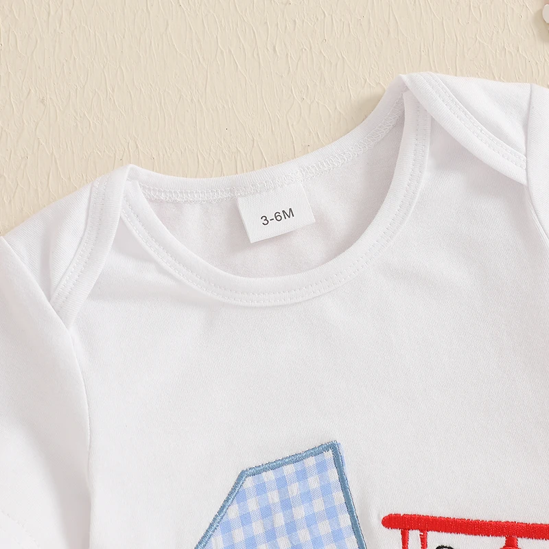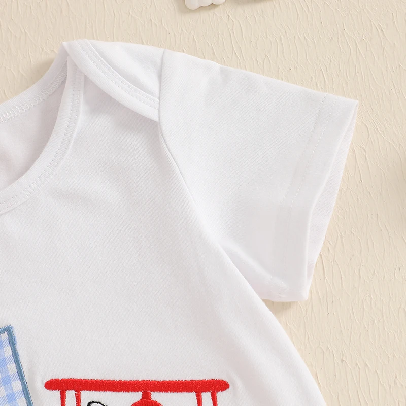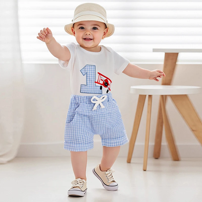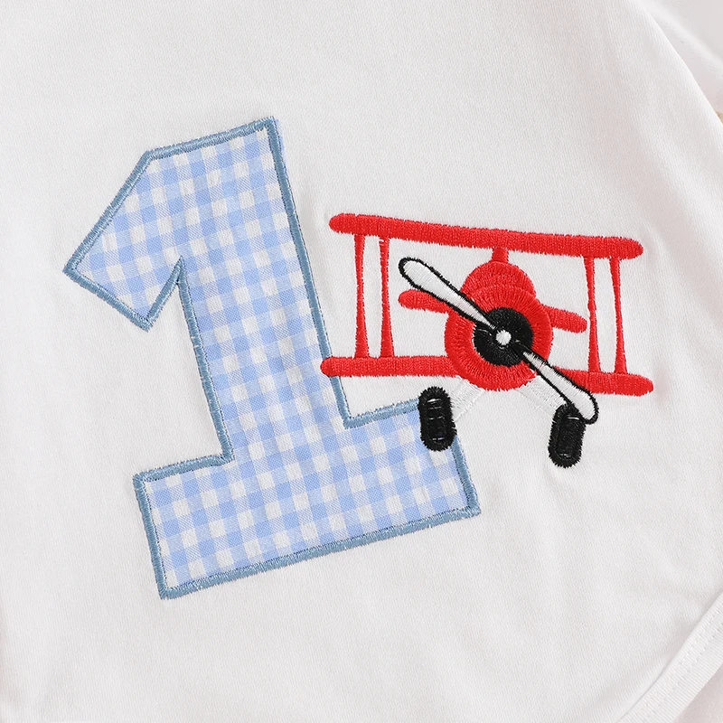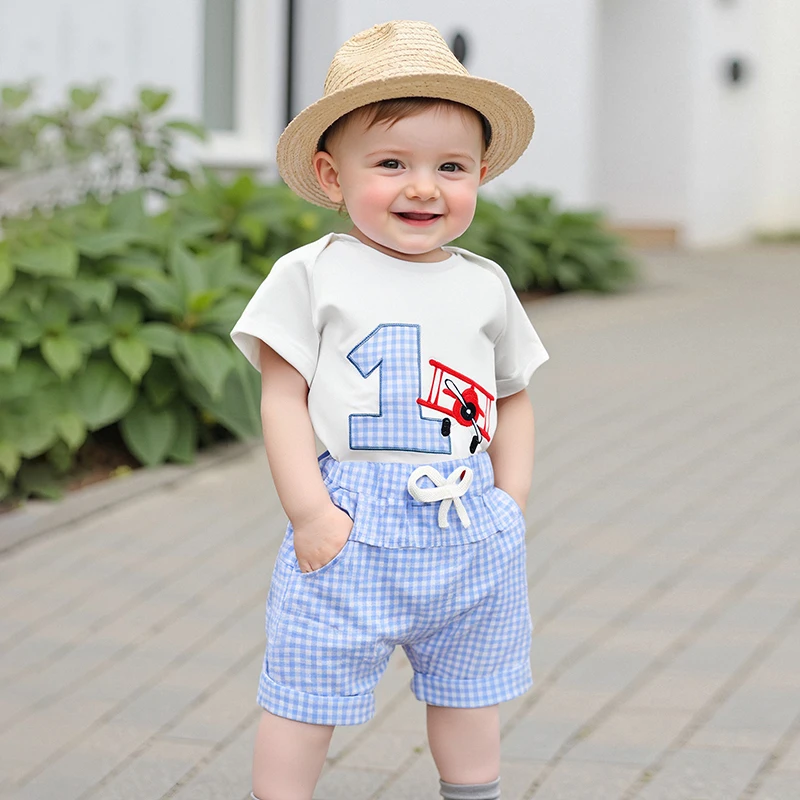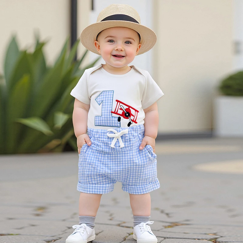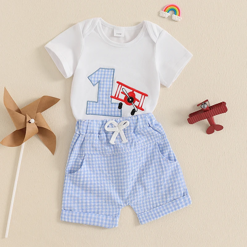 Conjunto de primer cumpleaños para bebé niño, número de avión, bordado, manga corta, cuello redondo, mameluco, bolsillos, pantalones cortos, trajes a cuadros de 2 piezas