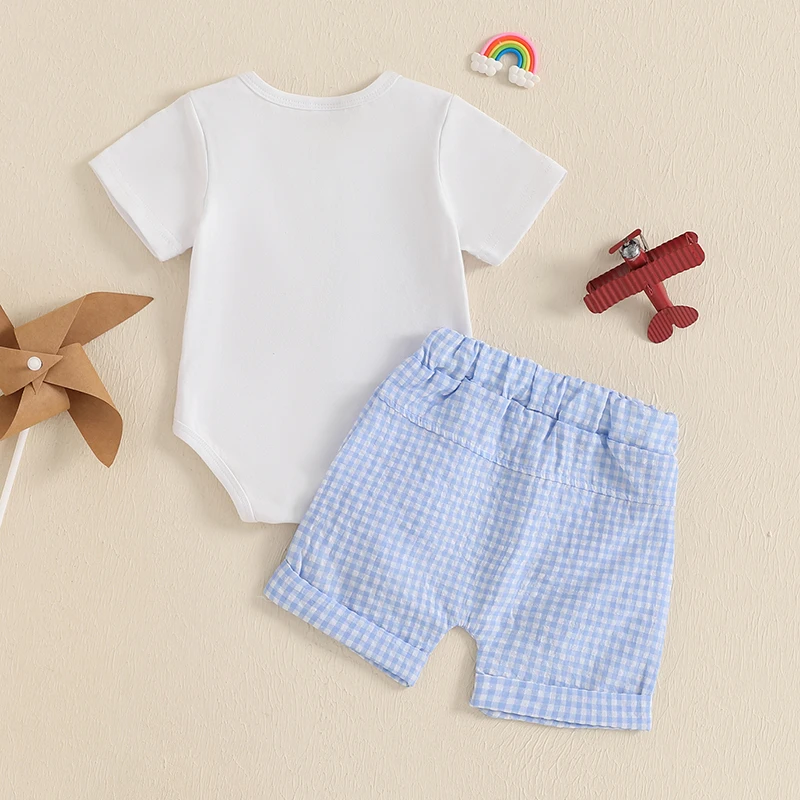 Conjunto de primer cumpleaños para bebé niño, número de avión, bordado, manga corta, cuello redondo, mameluco, bolsillos, pantalones cortos, trajes a cuadros de 2 piezas