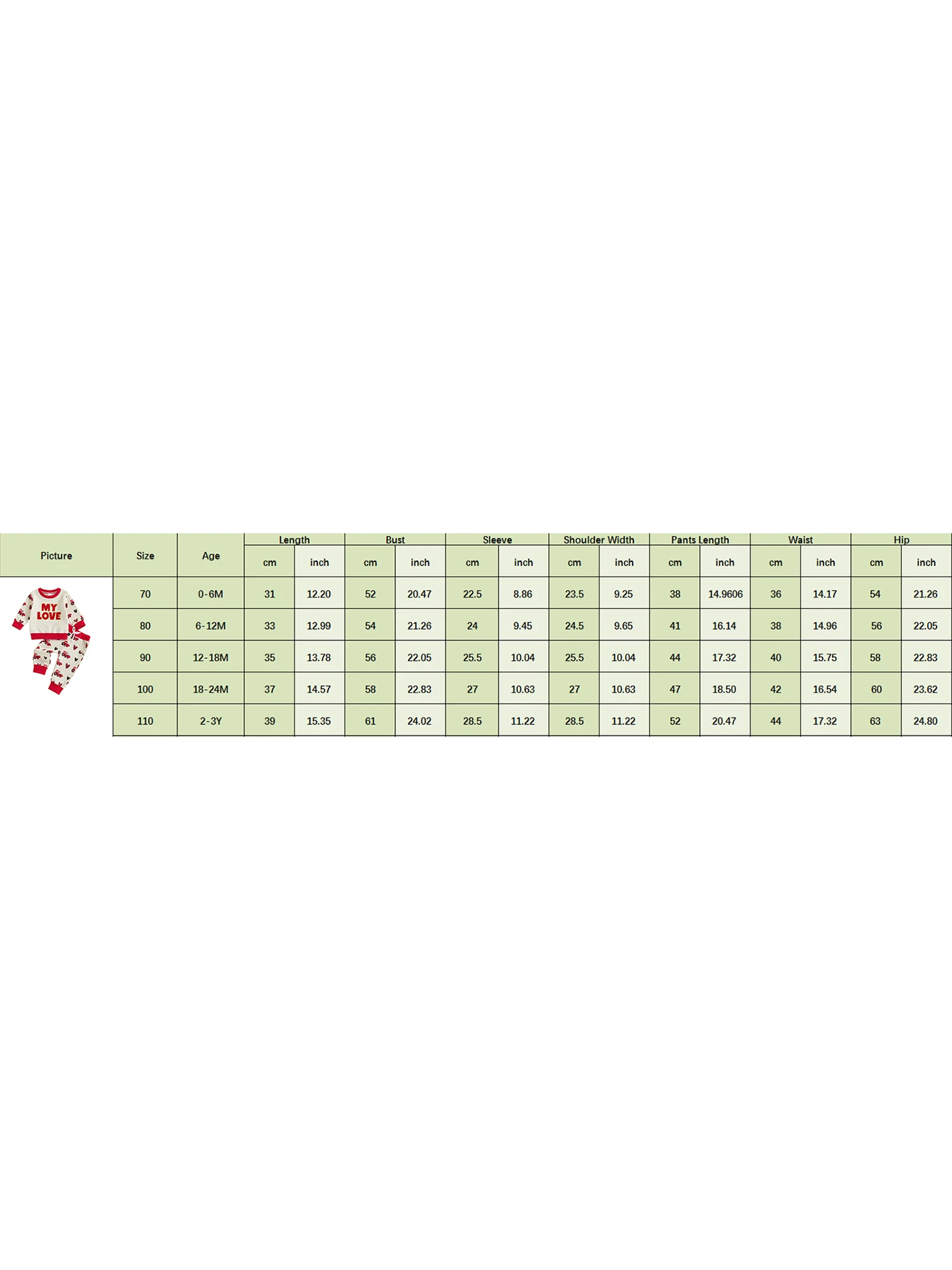 110 Largo: 15,35 Busto: 24,02 Manga: 11.22 Ancho de hombros: 11.22 Largo de pantalones: 20,47 Cintura: 17,32 Cadera: 24,80 Edad recomendada: 2-3 años