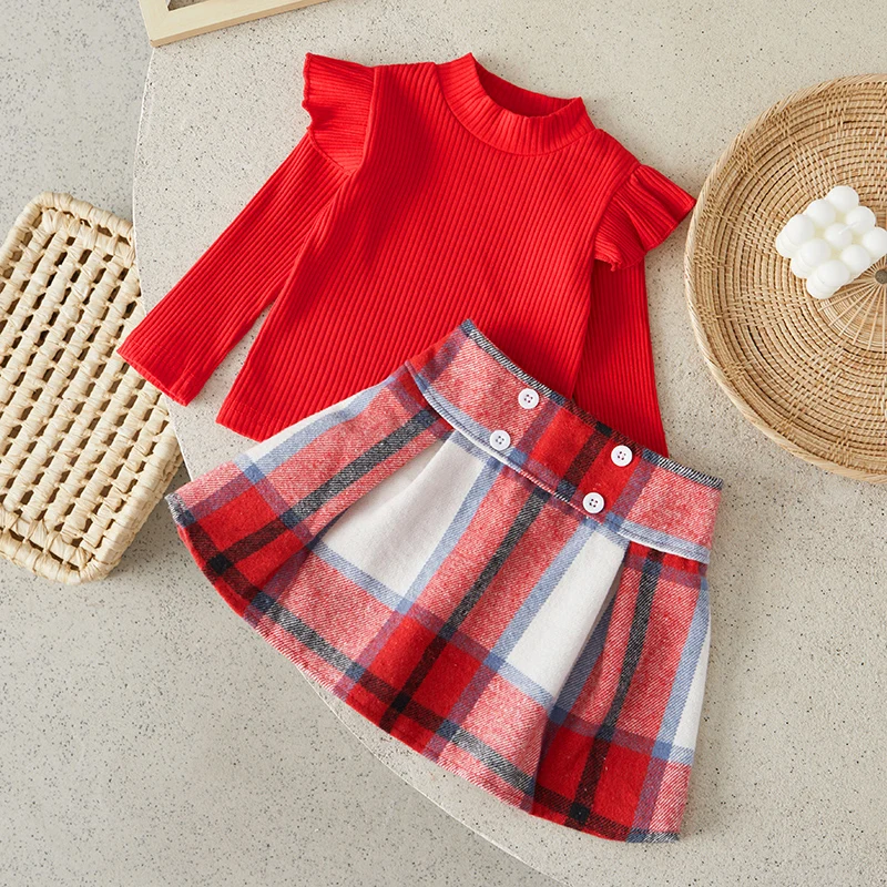 Conjunto de 2 piezas para niña de otoño, tops acanalados de manga larga con volantes, falda acampanada de cintura alta a cuadros