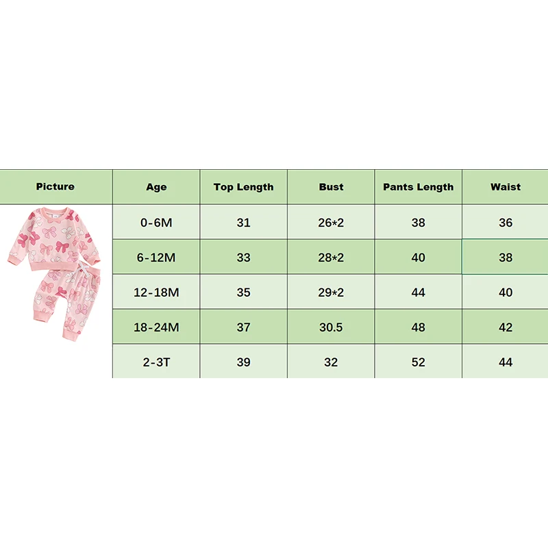 2-3Y Longitud de la parte superior: 15,35 Busto: 25,2 Longitud de los pantalones: 20,47 Cintura: 17,32 Edad recomendada: 2-3 años