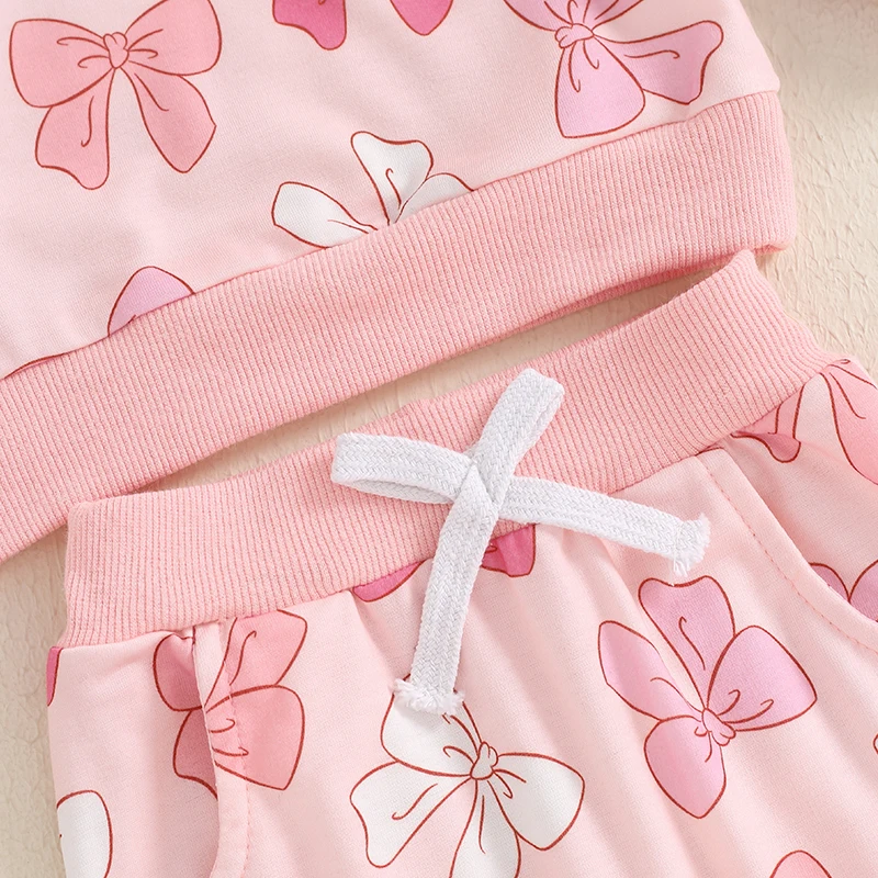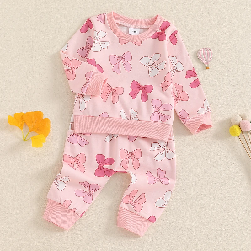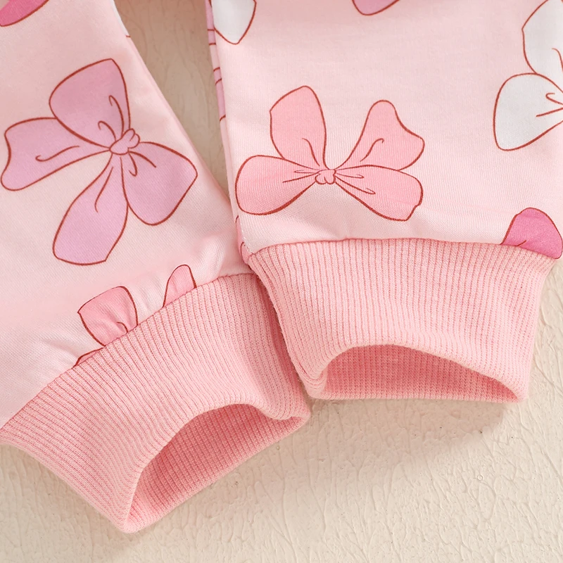 Conjuntos de otoño para niñas pequeñas, manga larga, cuello redondo, estampado de lazo, pantalones con cordón