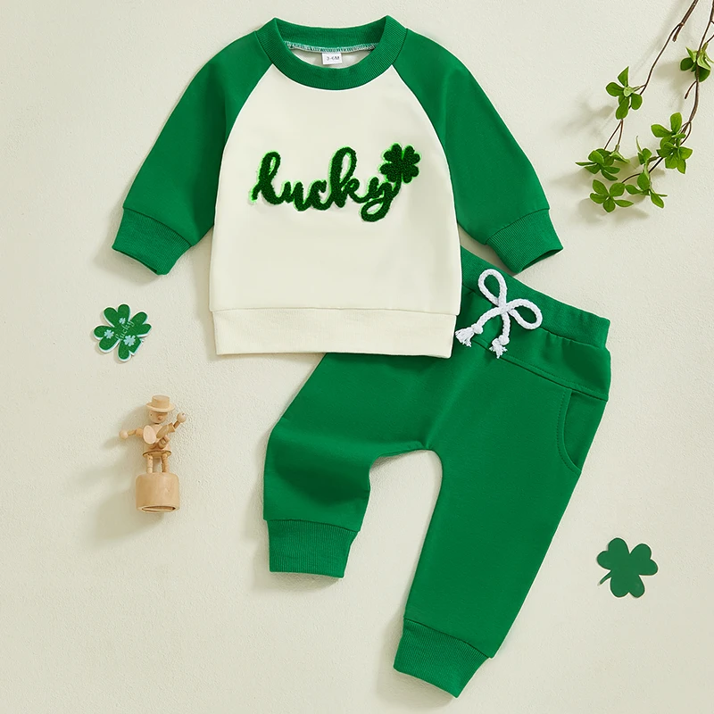 Comprar Suefunskry Conjunto de 2 piezas de trajes de primavera para bebé, sudadera de manga larga con bordado de letras de trébol y pantalones, conjunto para el día de San Patricio