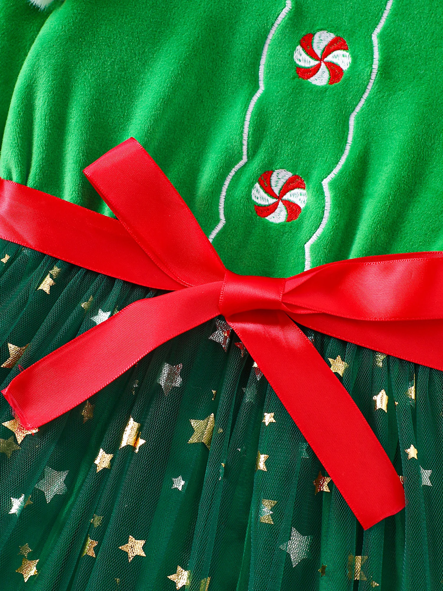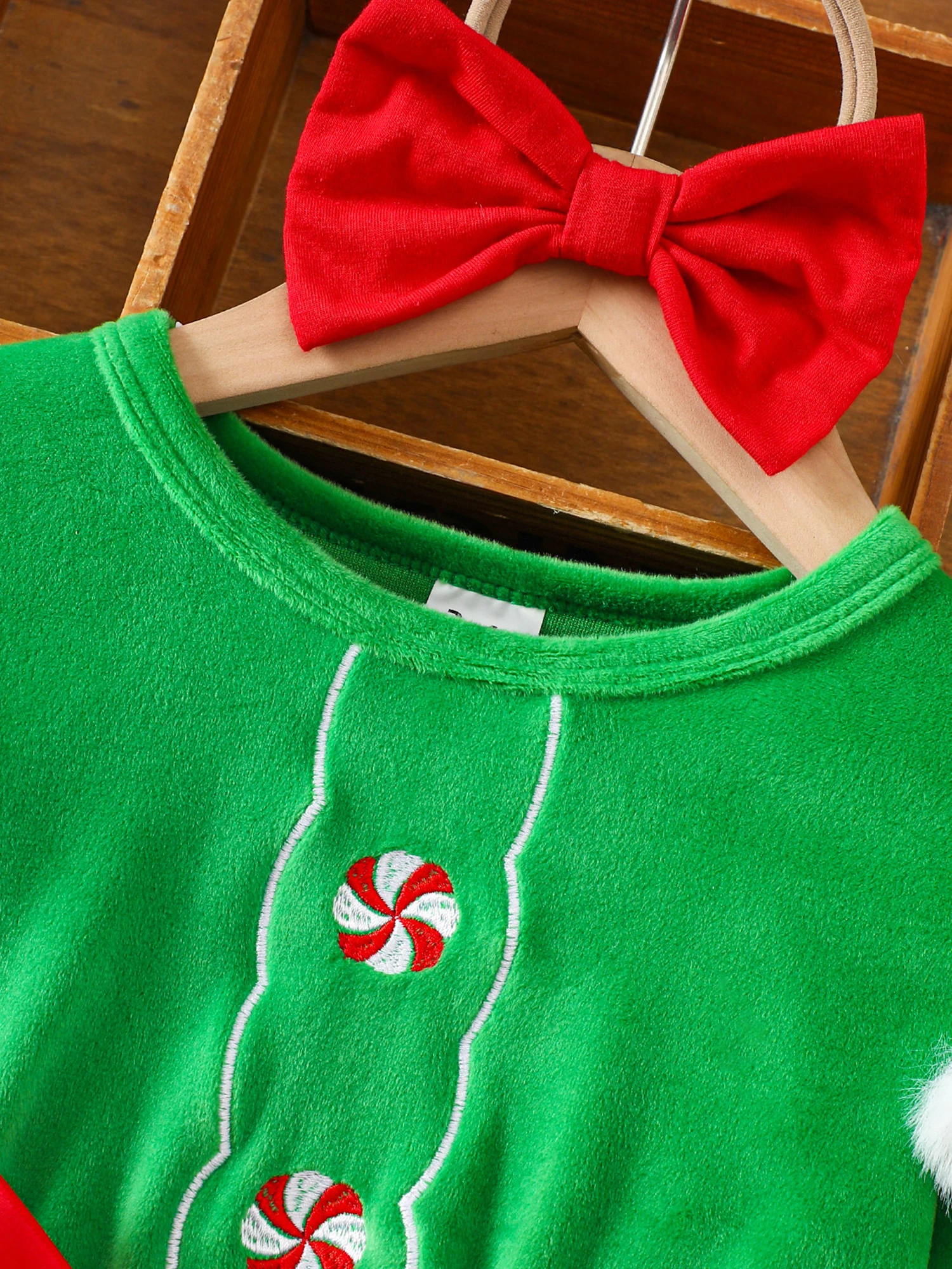 Conjunto de 2 piezas para niña pequeña de Navidad con adornos de piel y estrella de caramelo, cuello redondo, manga larga, vestido de línea A y diadema con lazo