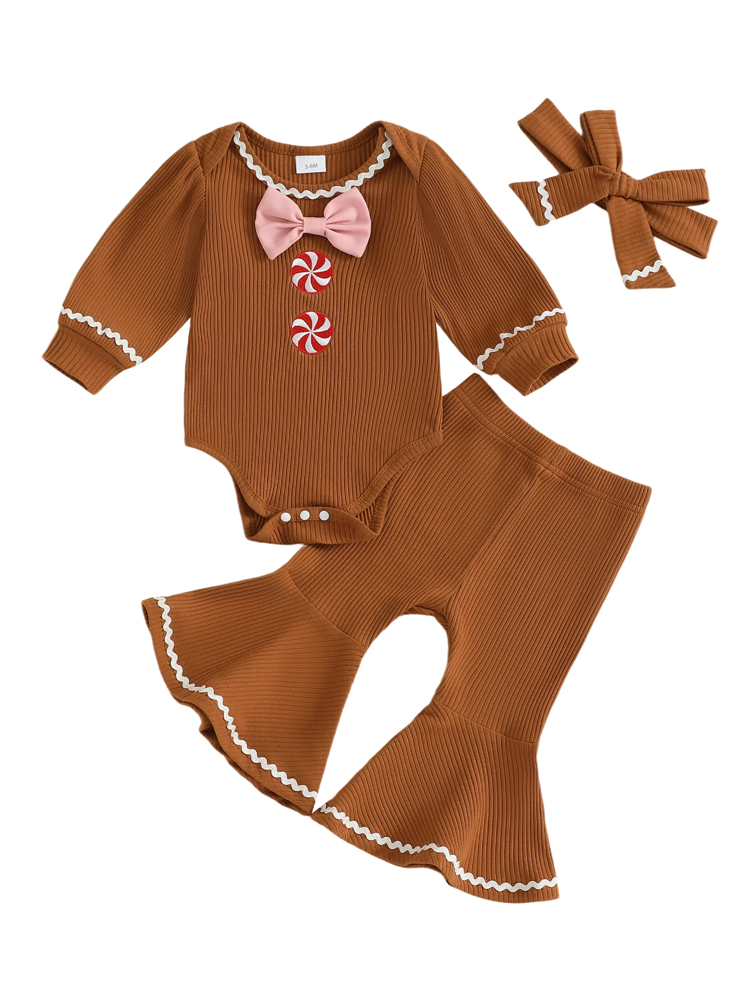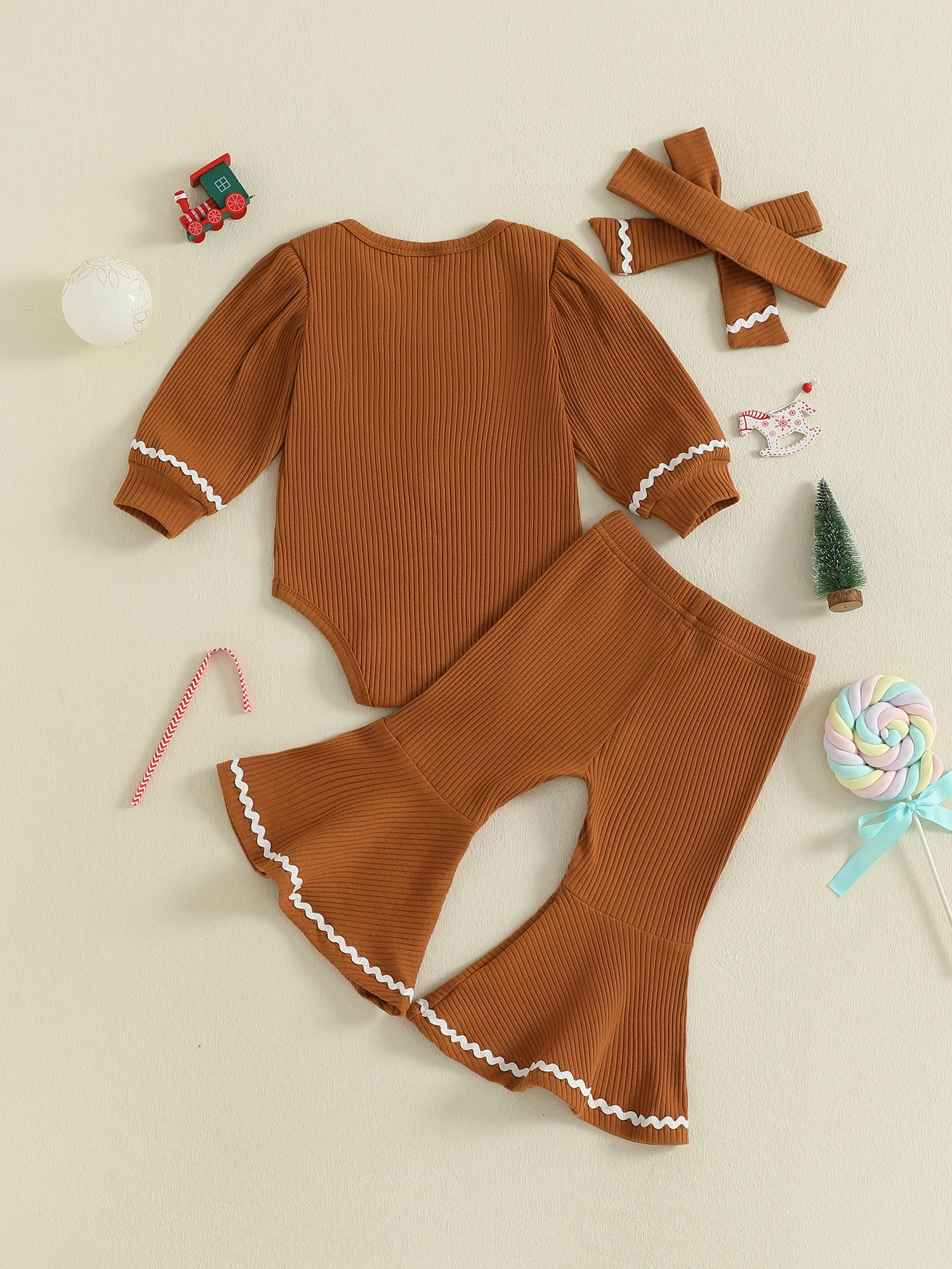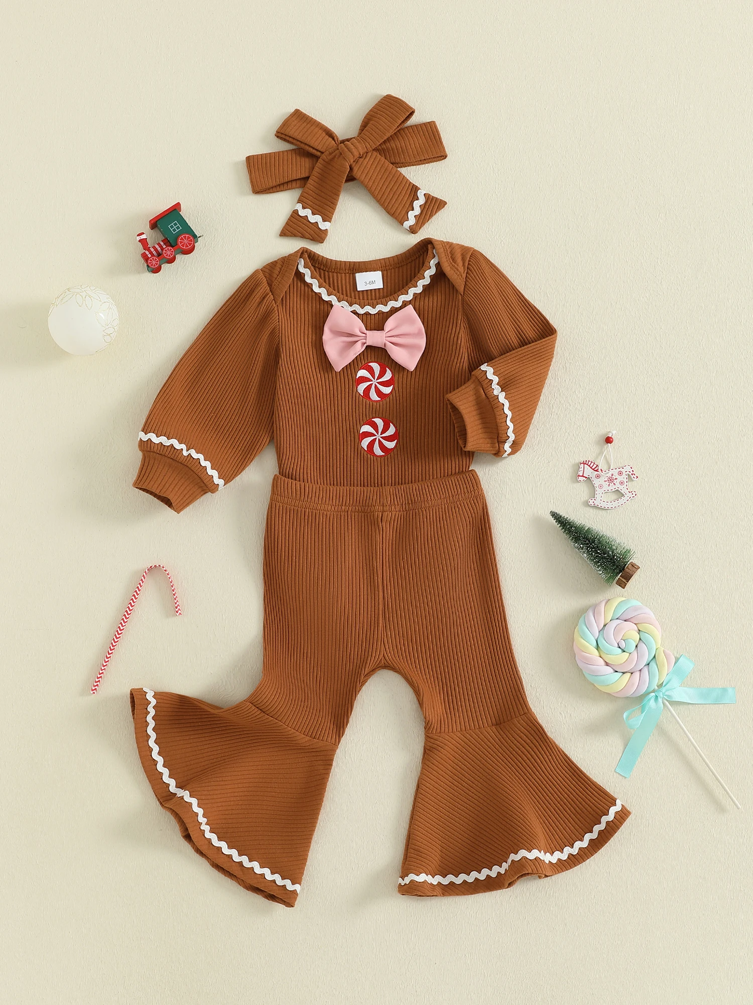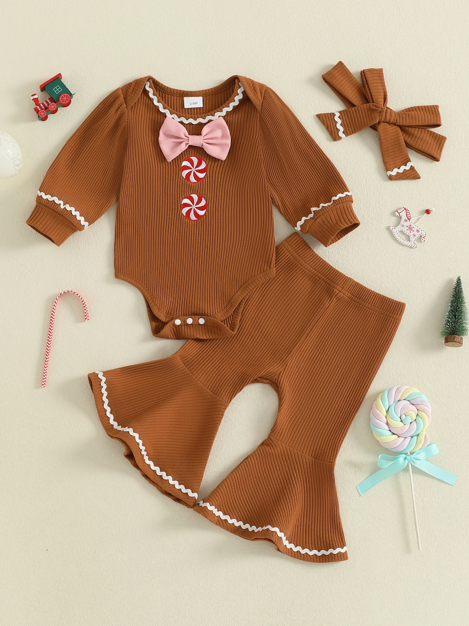 Conjunto de 3 piezas de mameluco de manga larga con pantalones acampanados y diadema para niña de Navidad