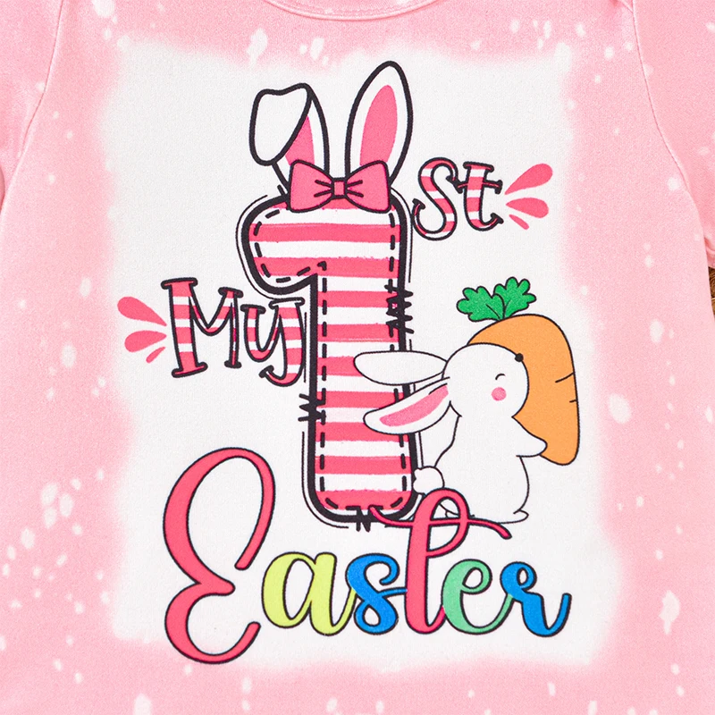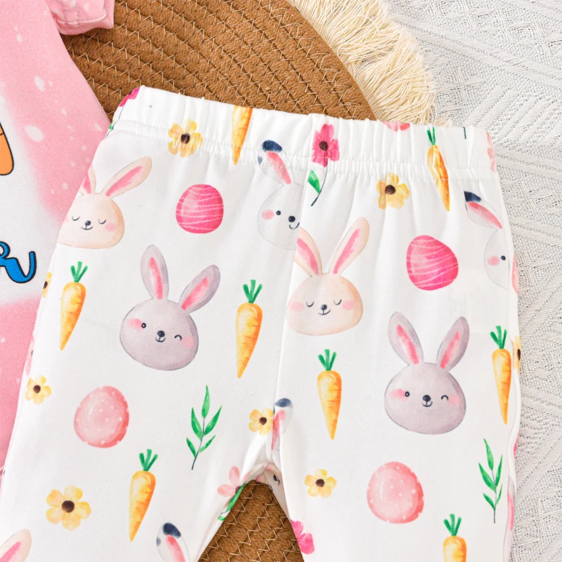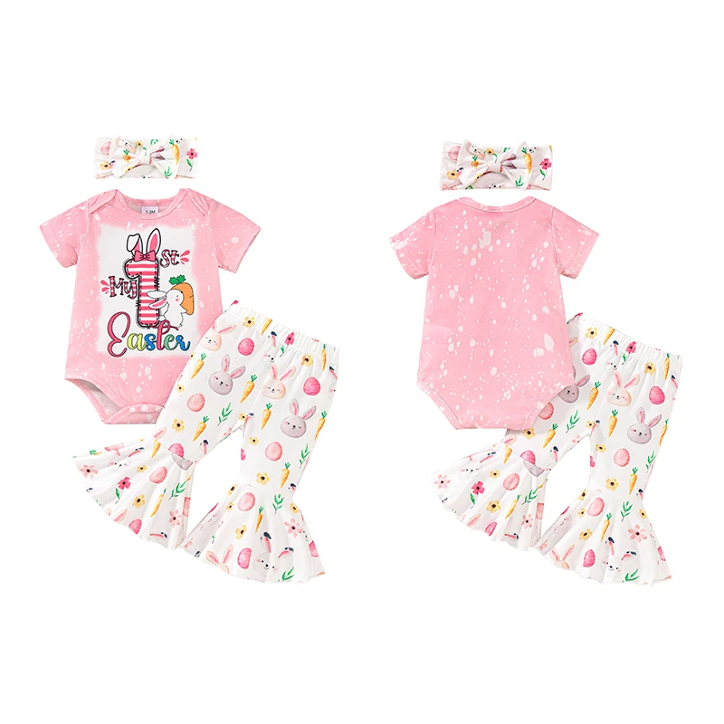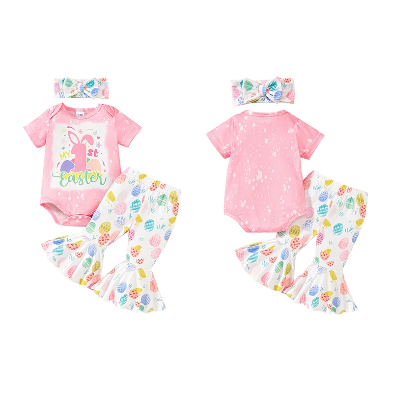 Conjunto de 3 piezas de traje de Pascua para niña, pelele de manga corta con estampado de huevos, pantalones acampanados, diadema con lazo