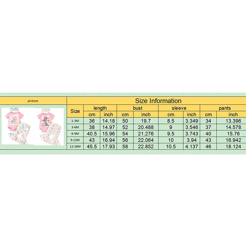 1-3M Longitud de la camiseta: 14,17 Busto: 18,9 Manga: 3,35 Hombro: 7,09 Longitud de los pantalones: 13,39 Edad recomendada: 1-3 meses