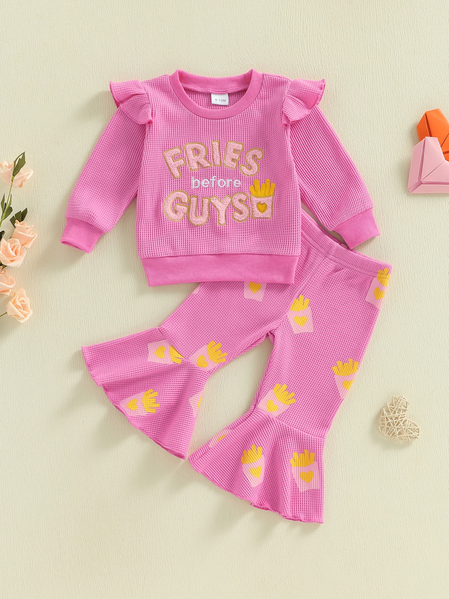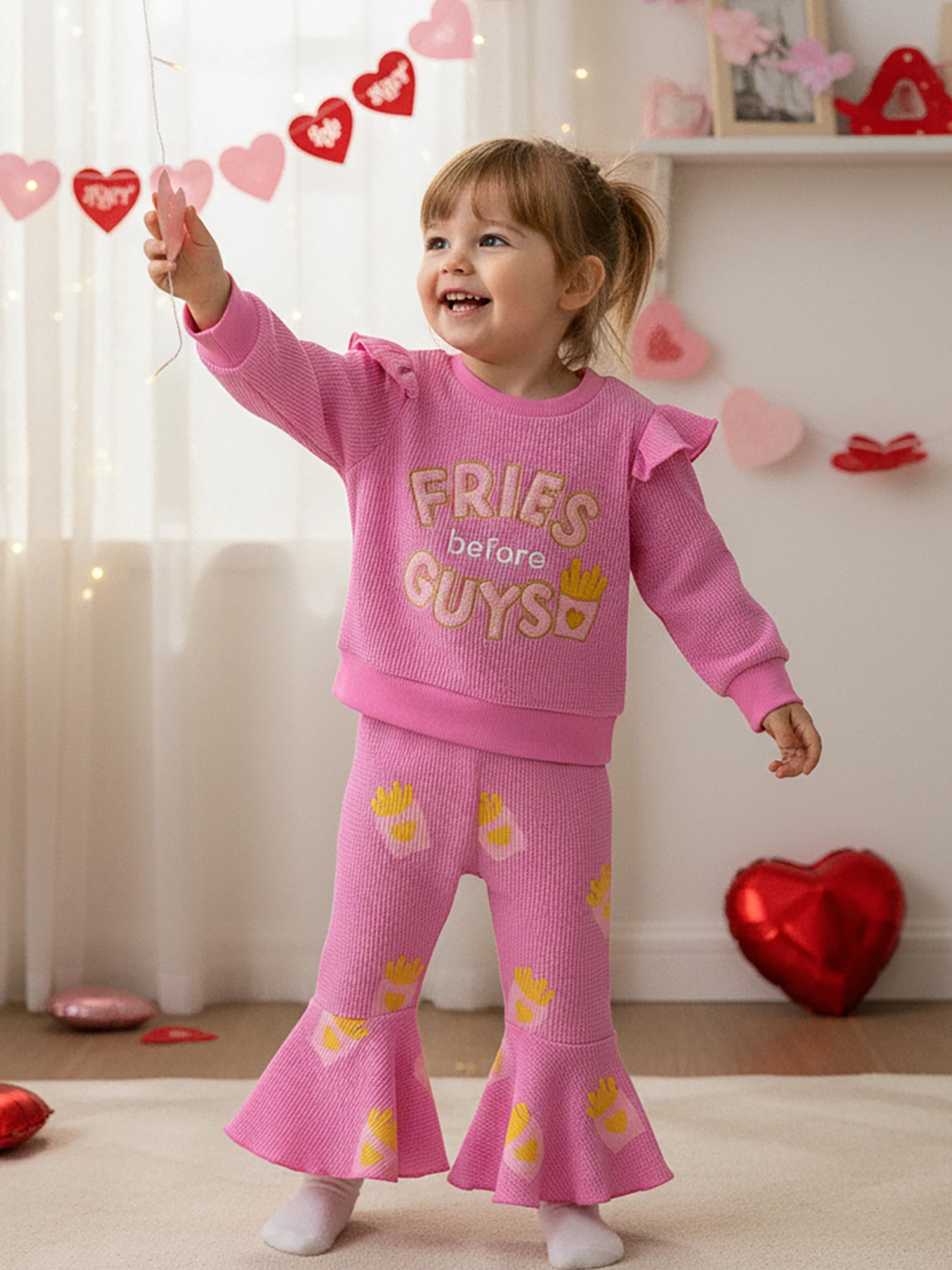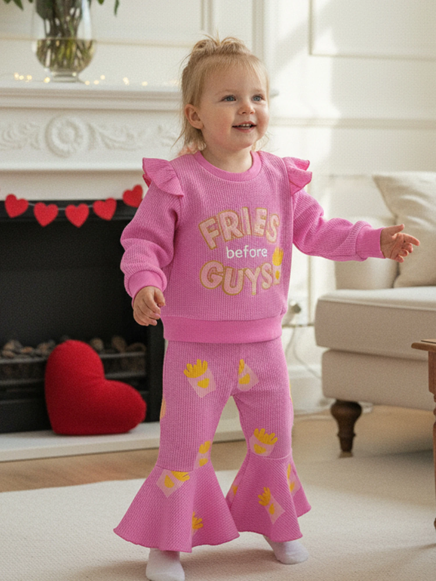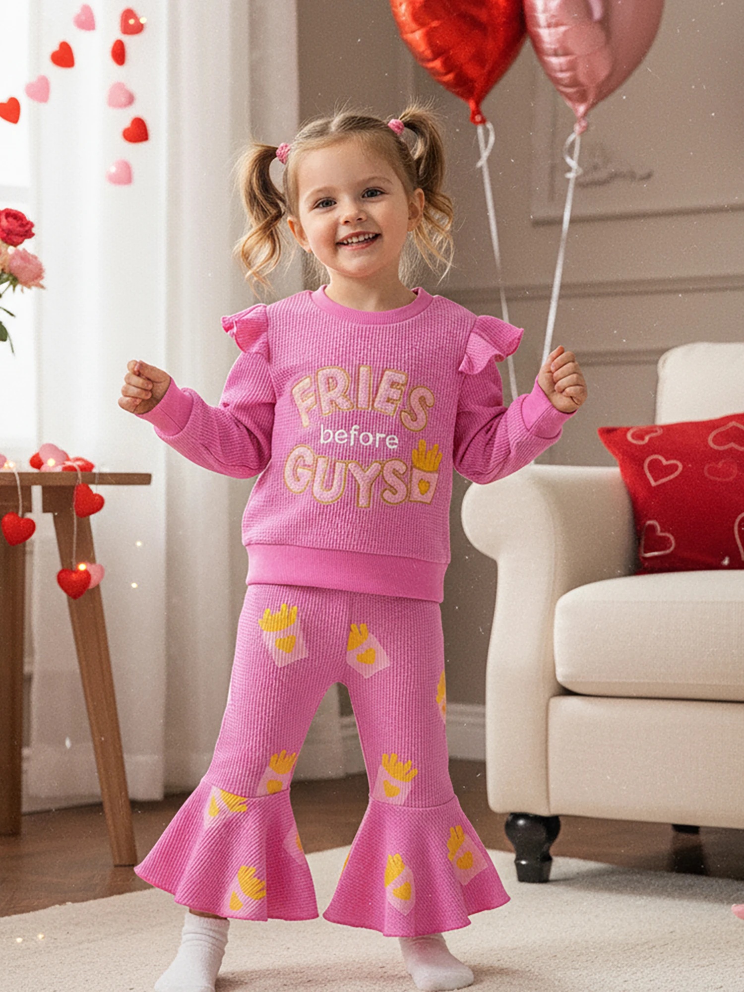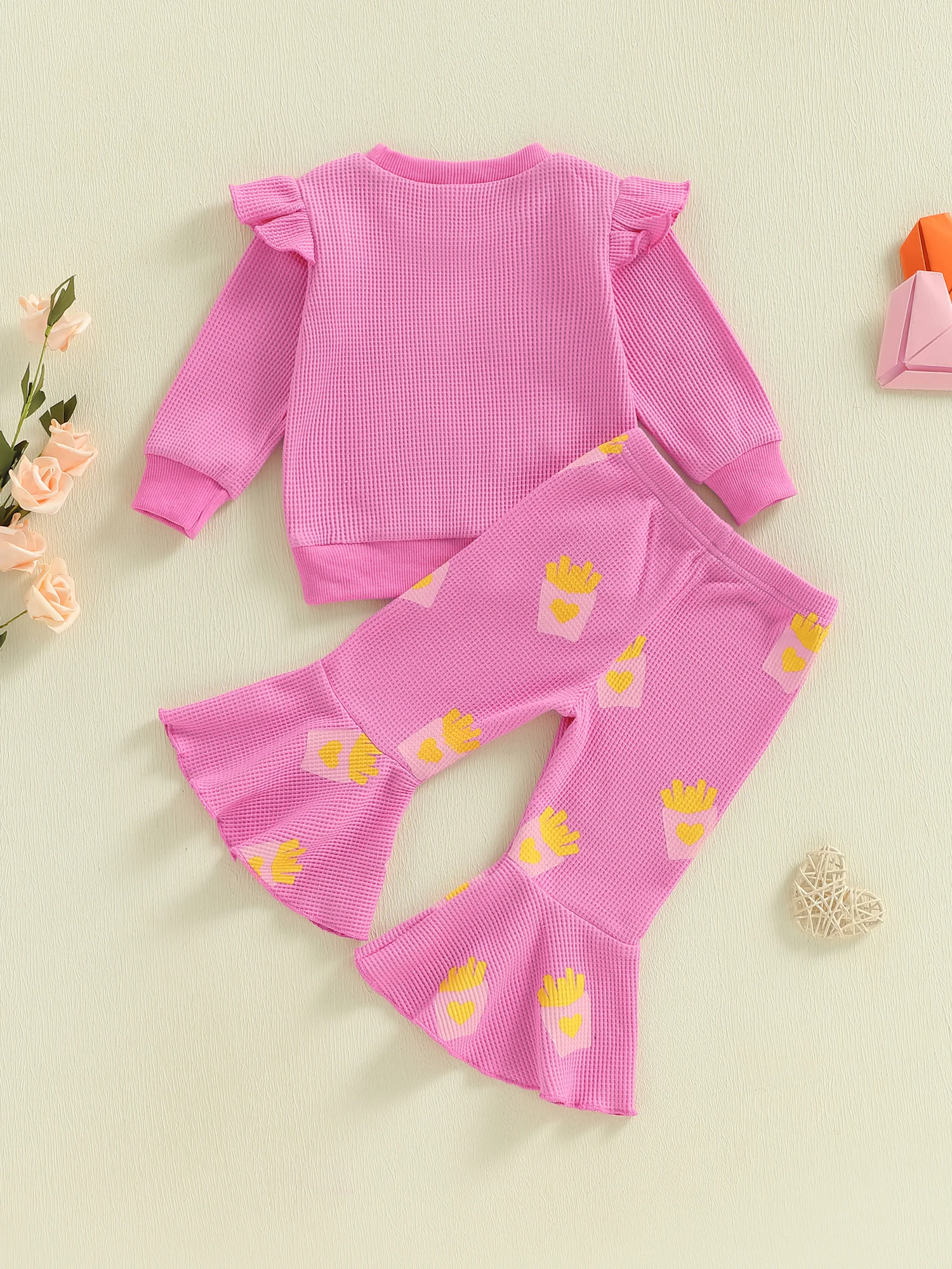 Conjunto de pantalones para niñas, sudadera de manga larga con letras bordadas y pantalones acampanados con estampado de patatas fritas, ropa del Día de San Valentín