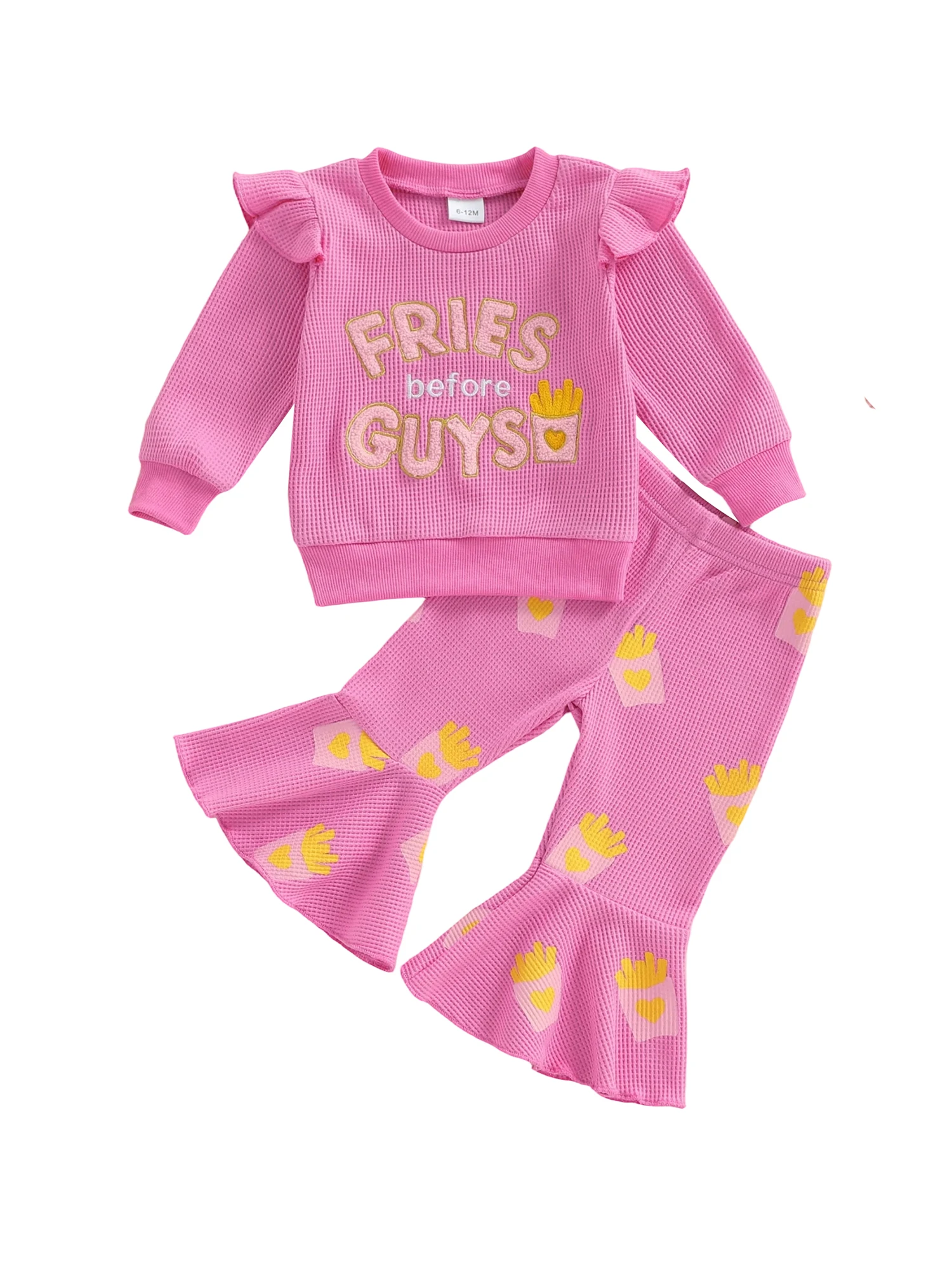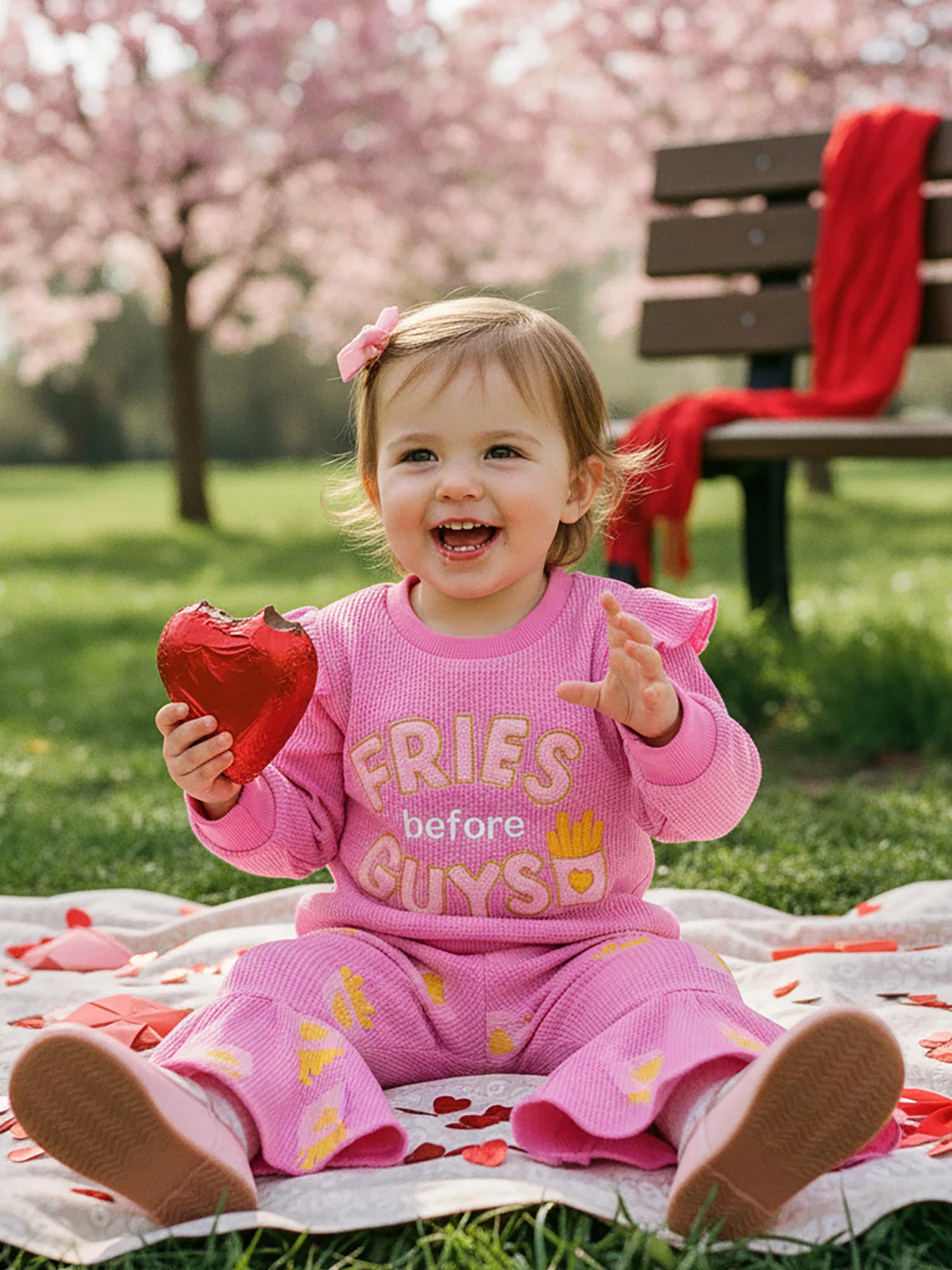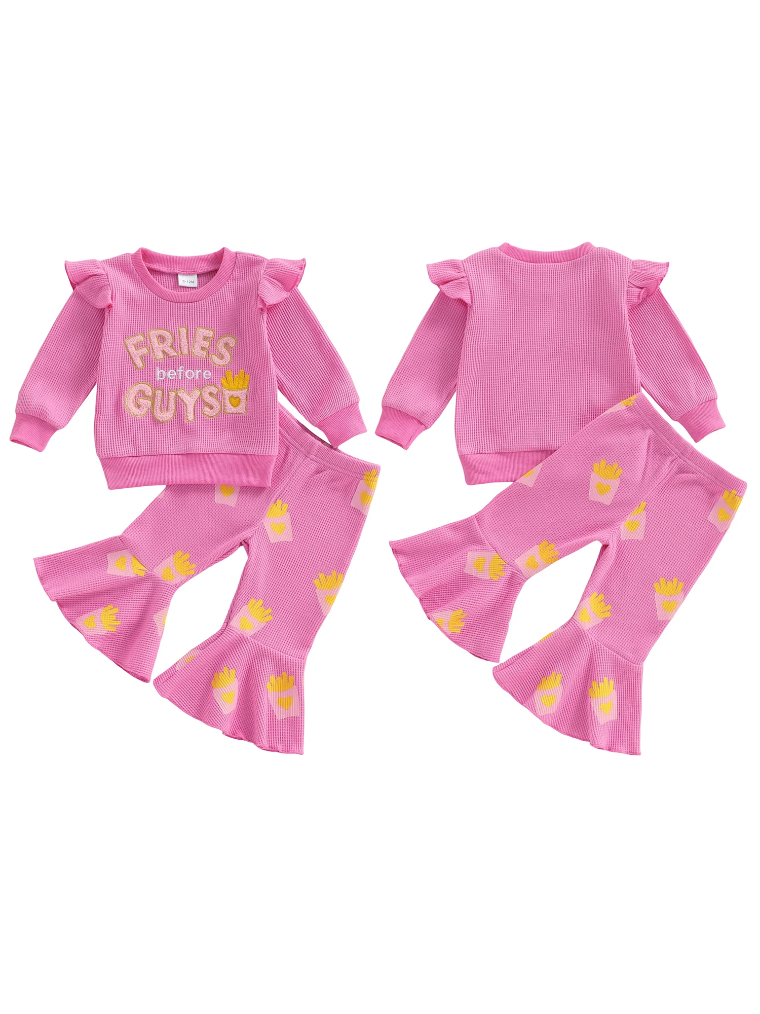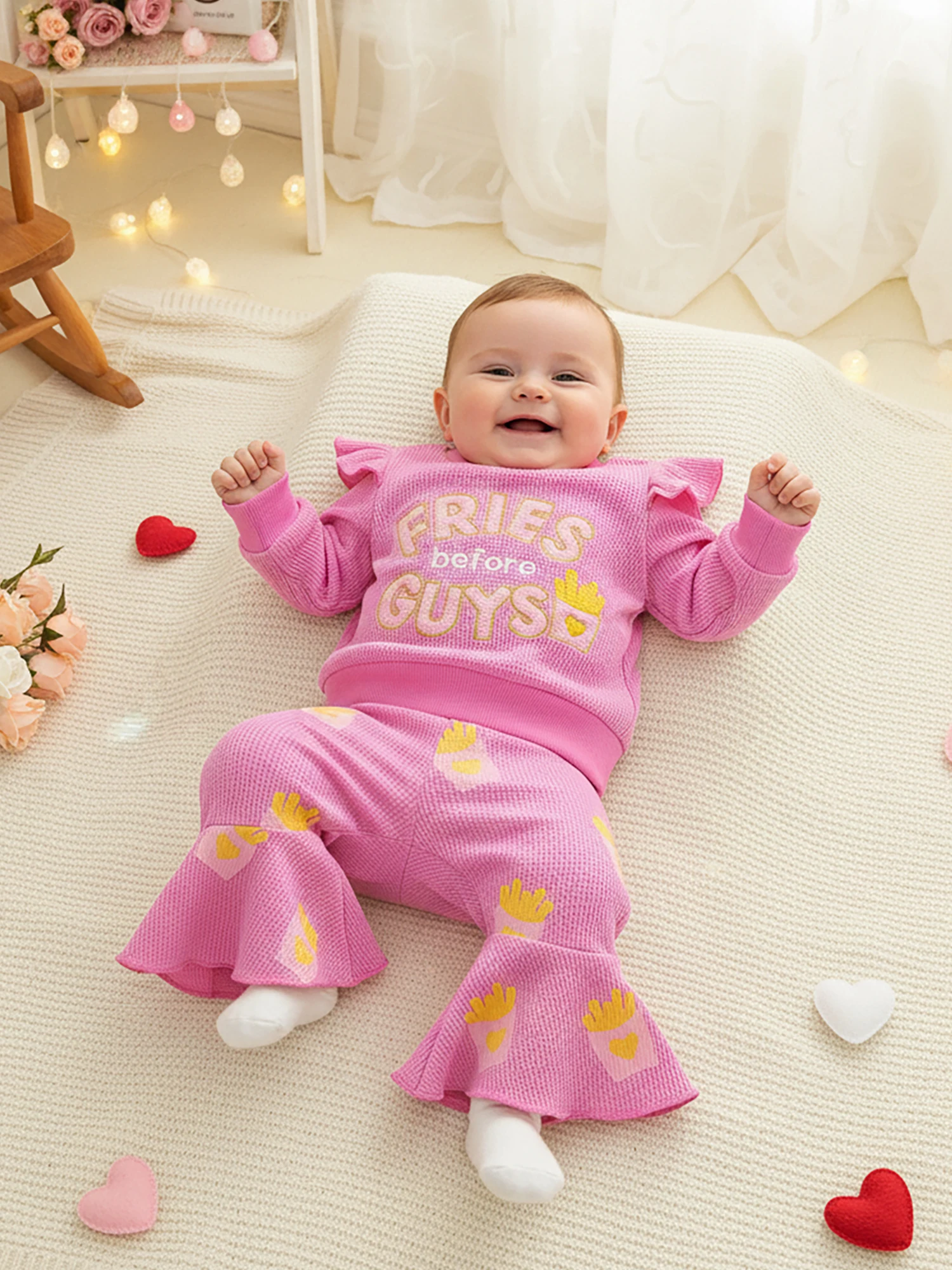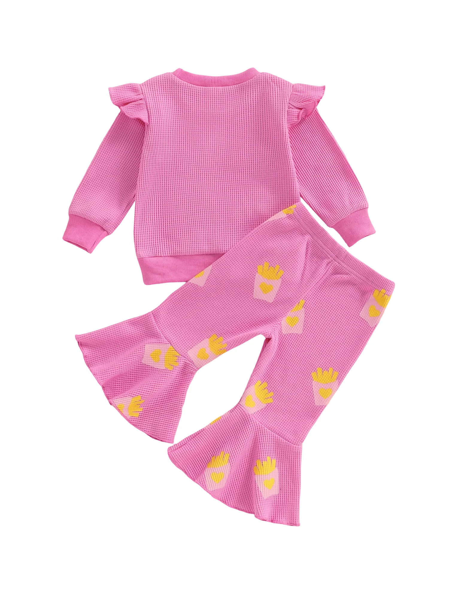 Conjunto de pantalones para niñas, sudadera de manga larga con letras bordadas y pantalones acampanados con estampado de patatas fritas, ropa del Día de San Valentín