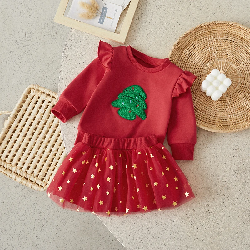 Traje de Navidad para niña, sudadera de manga larga con bordado de árbol/Papá Noel y falda de tul con estrellas, traje de otoño