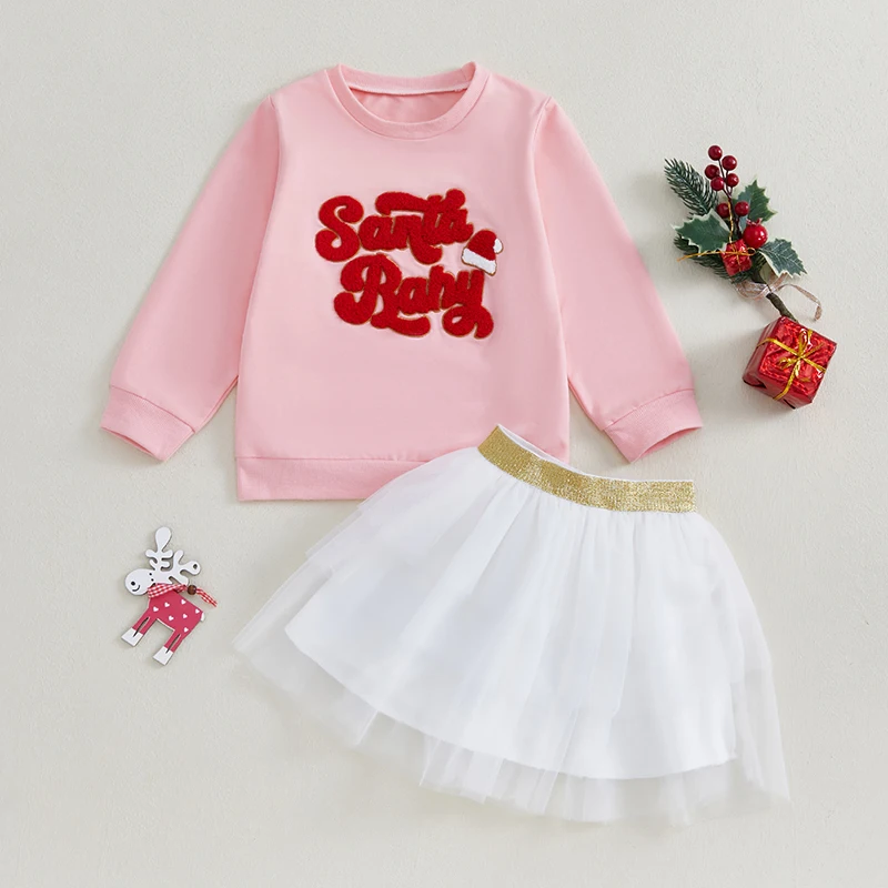 Comprar Suefunskry-conjunto navideño para niñas pequeñas, sudadera de manga larga con letras bordadas, Tops, falda de gasa hinchada, trajes de 2 piezas